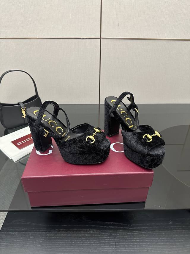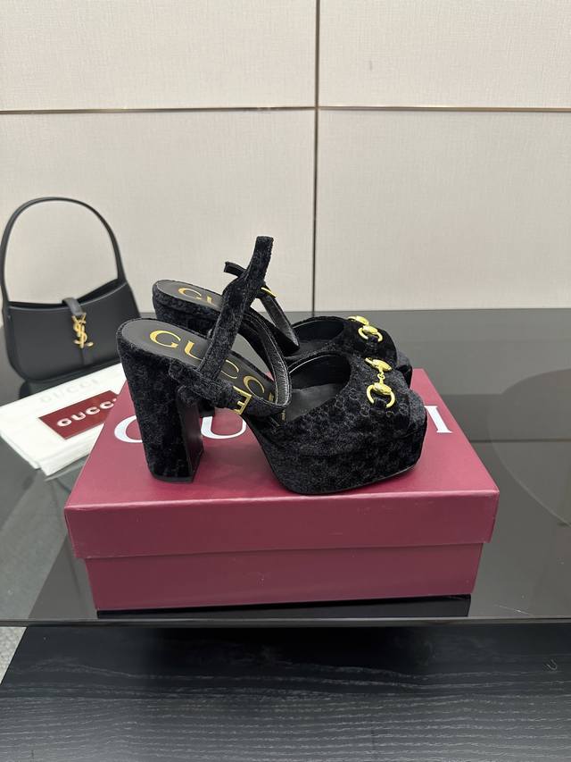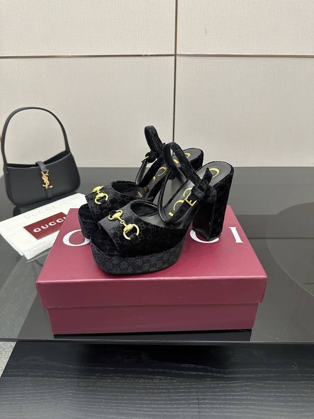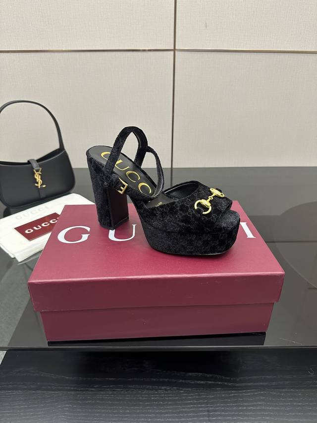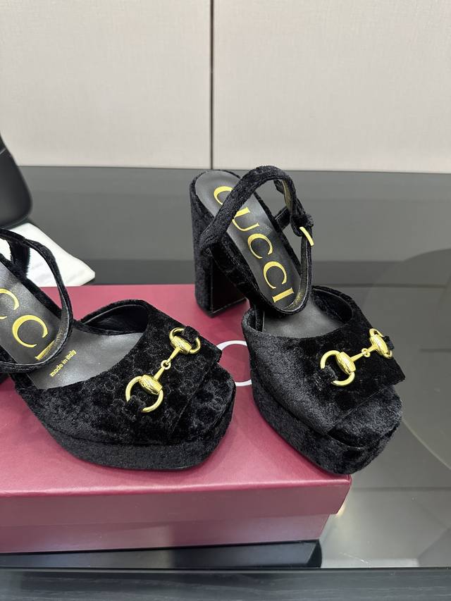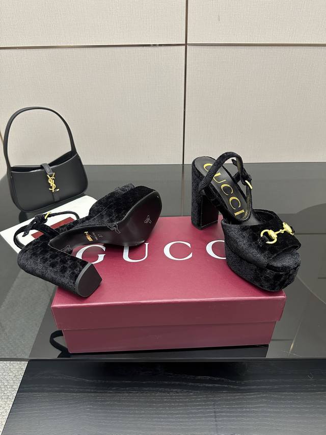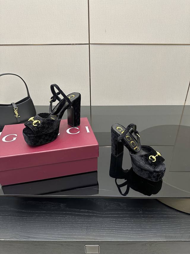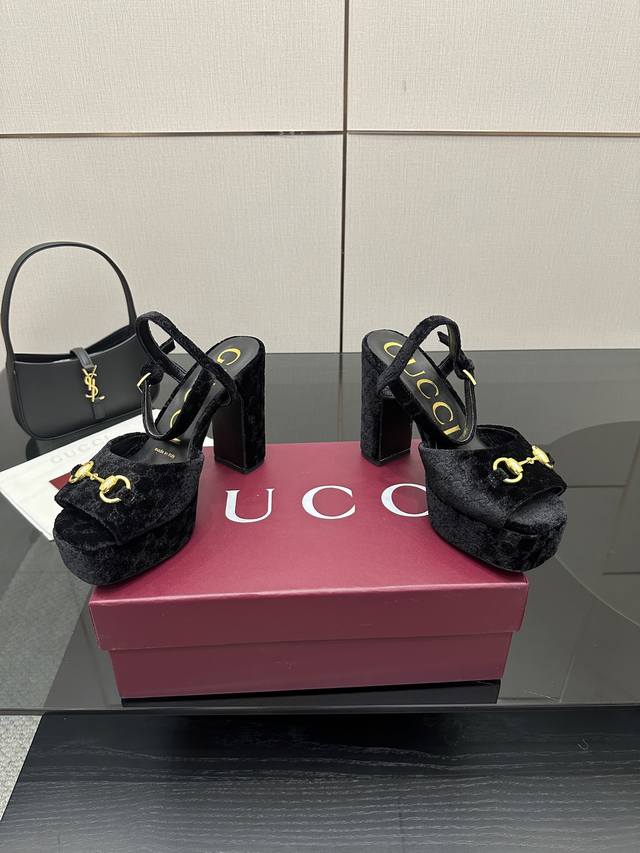 Gucci2025最新水台凉鞋 这款女士漏趾凉鞋彰显品牌传承,尽显别样魅力。采用精致羊皮打造,设计优雅而不失随性,是暖季造型的清爽理想单品 顶级版本、欢迎比对. 原版1:1复刻 注意请认准咱家正品保证 鞋面:进口高档丝绒 内里 垫脚:全粒纹高档小羊皮 鞋底:真皮大底 跟高:10.5Cm 水台:3.3Cm 配码:35-41 41 40定做不退换