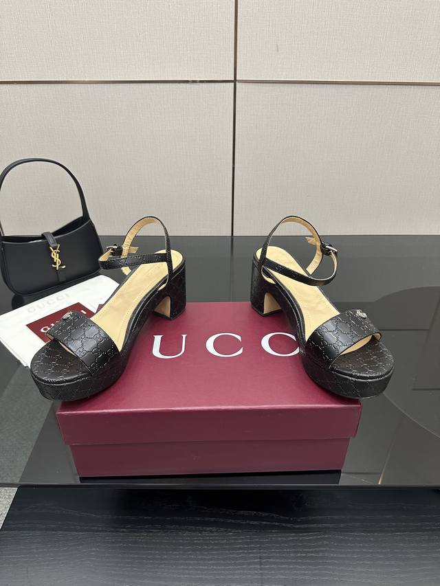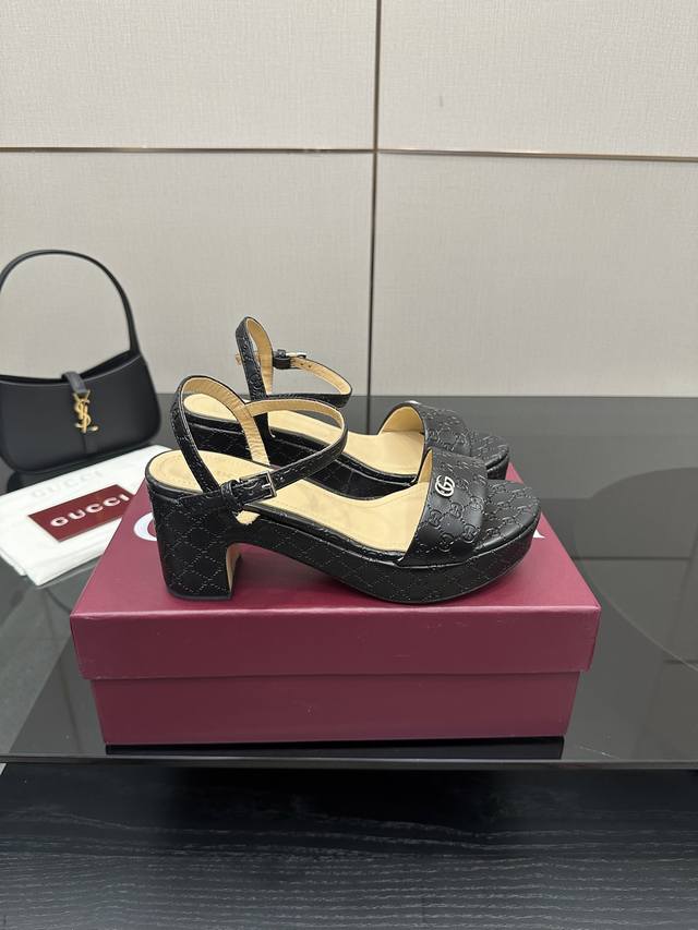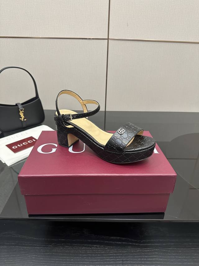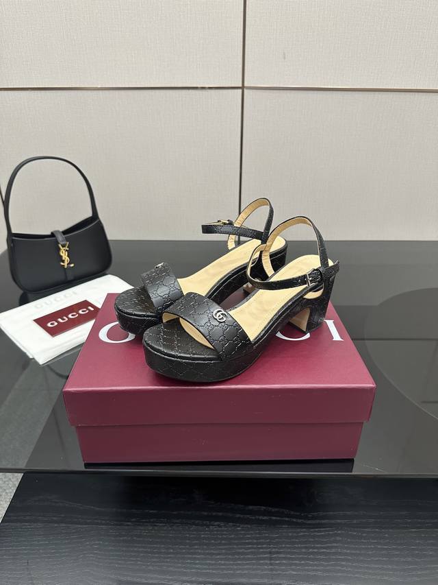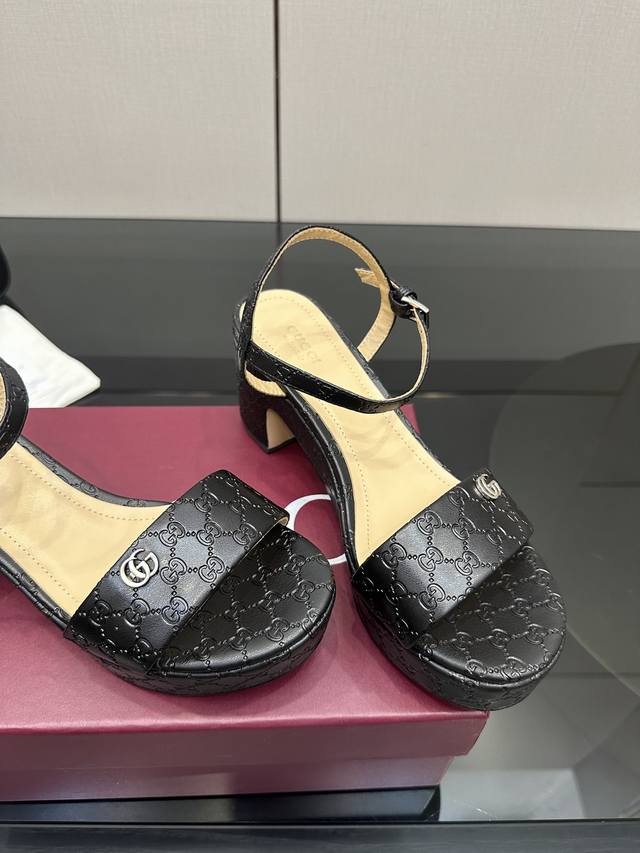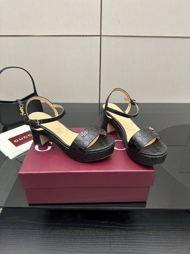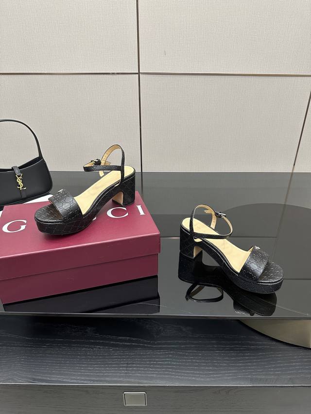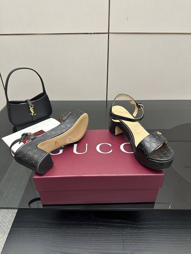 Gucci2025最新水台凉鞋 这款女士漏趾凉鞋彰显品牌传承,尽显别样魅力。采用精致羊皮打造,设计优雅而不失随性,是暖季造型的清爽理想单品 顶级版本、欢迎比对. 原版1:1复刻 注意请认准咱家正品保证 鞋面:进口高档牛皮 内里 垫脚:全粒纹高档小羊皮 鞋底:真皮大底 跟高:7Cm 配码:35-41 41 40定做不退换