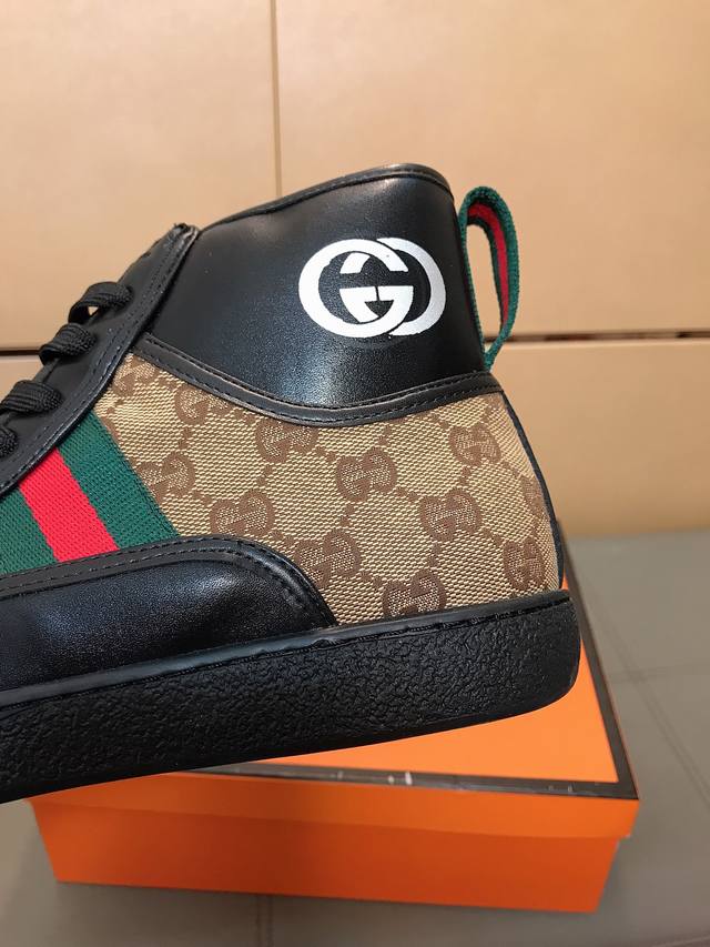 出厂价p Gucci 古奇 新款高帮男鞋休闲鞋绝对火爆潮男的极致搭配单品!超质感魅力挡不住,主推款,花皮色彩亮丽!鞋面选用优质牛皮+品牌印花面料,羊皮内里,垫脚