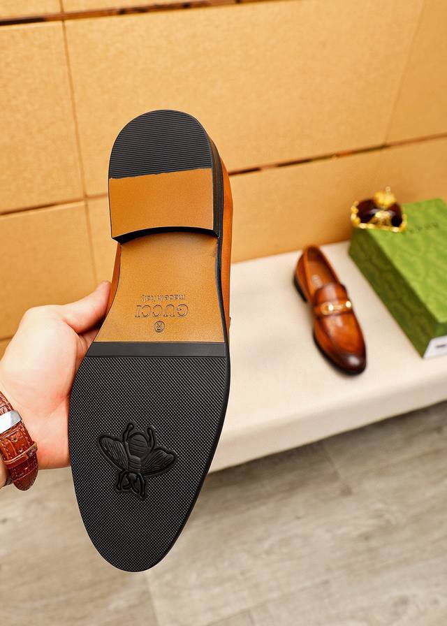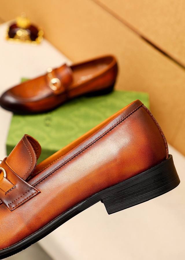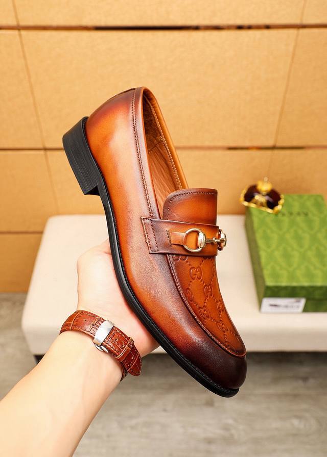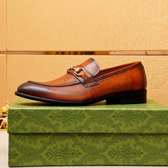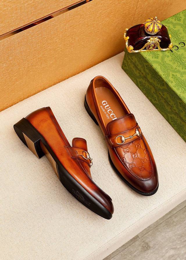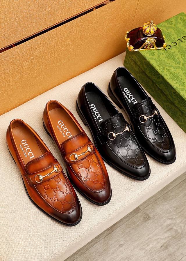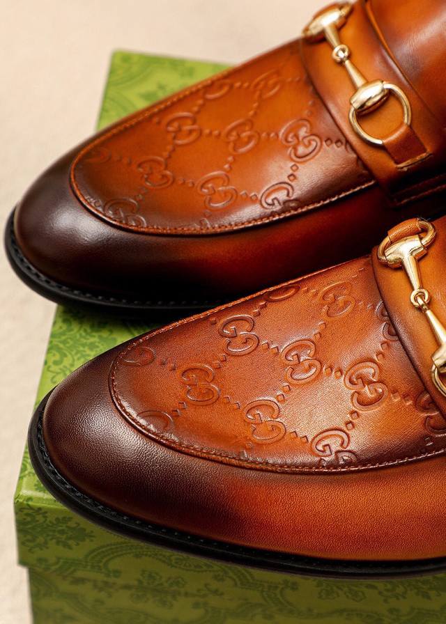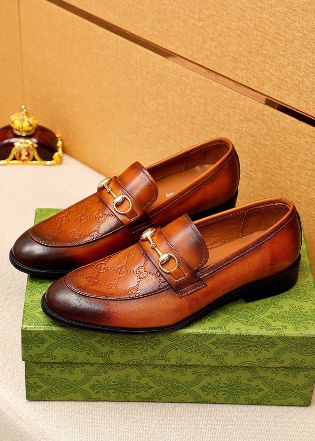 商品商标:Gucci 古驰 休闲皮鞋 正码码数: 39-44 38.45.46订制 商品材料:精选 进口头层小牛皮压花鞋面+奢华五金扣,进口羊皮内里。强烈立体视
