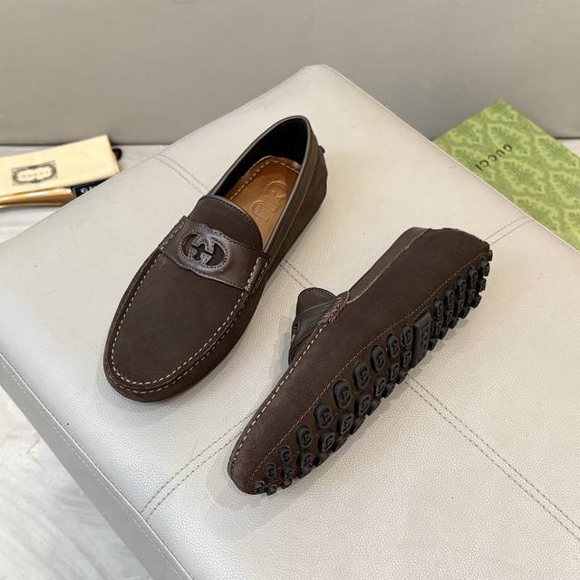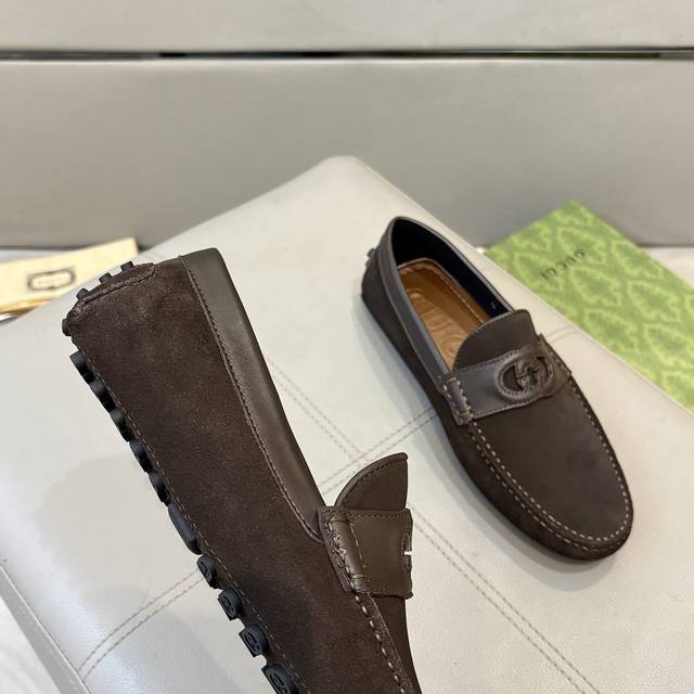 工厂p价 古奇男士豆豆鞋 2025官网同步 高端品质 市场顶级版本 进口头层磨砂皮黑色牛里垫脚水染棕牛里。 黑色进口磨砂皮 尺码38-45