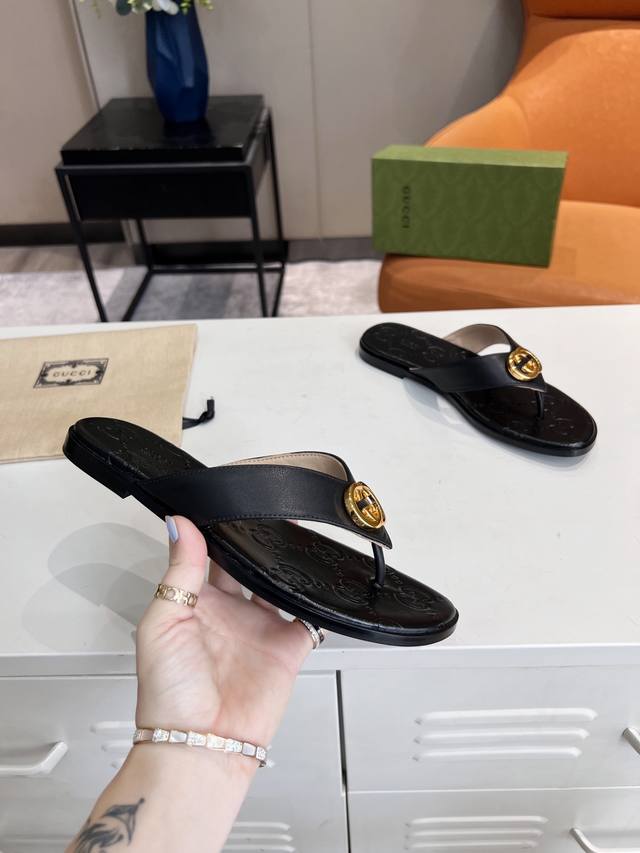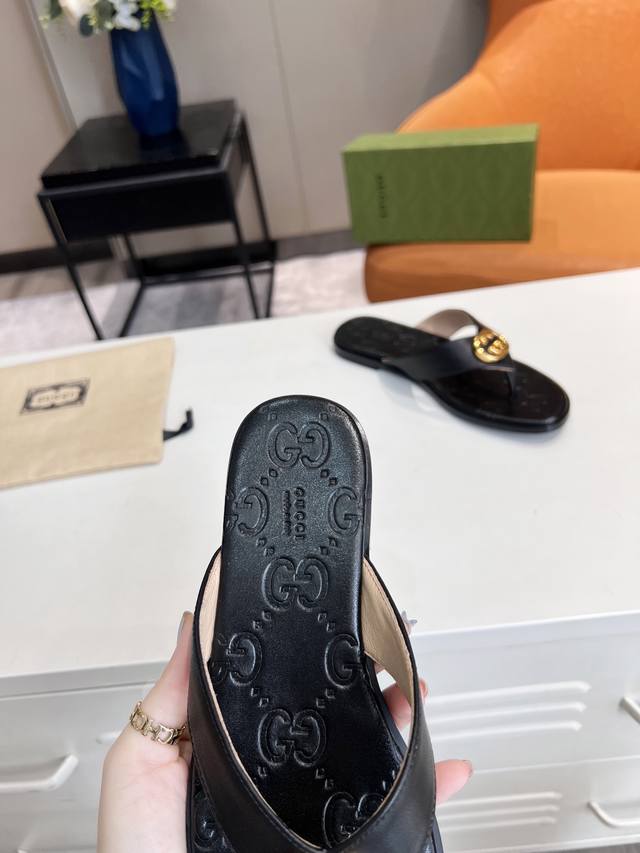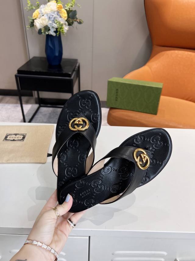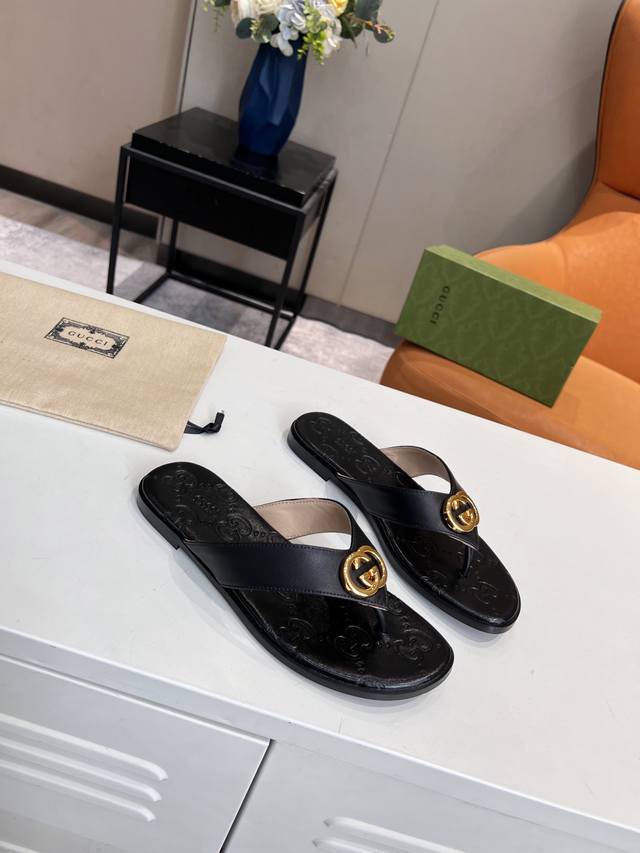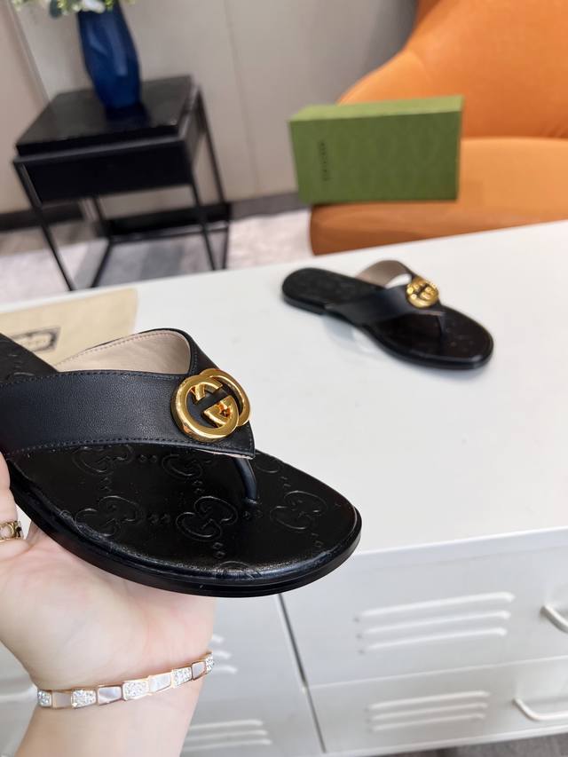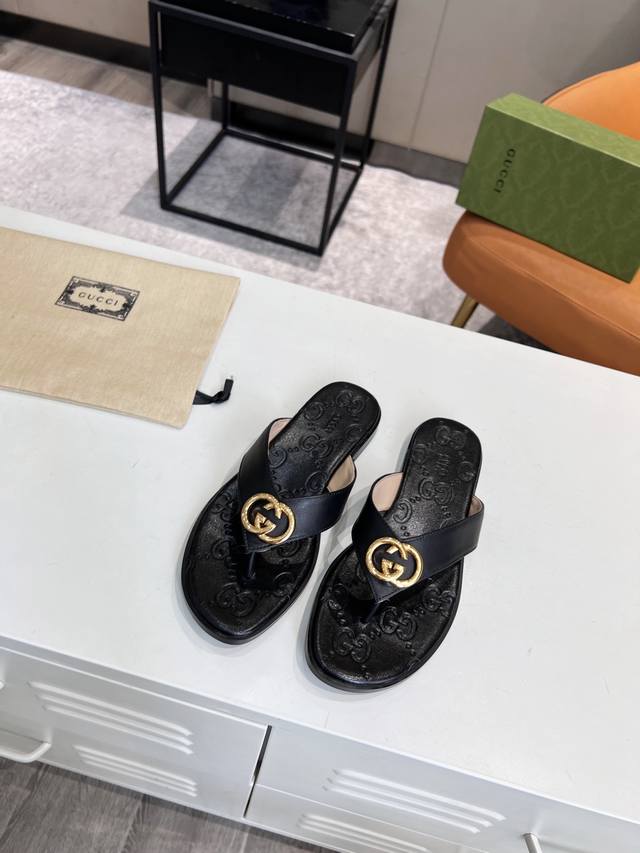 Guccl,25春夏新款休闲女土电绣双G凉拖,35-43码,