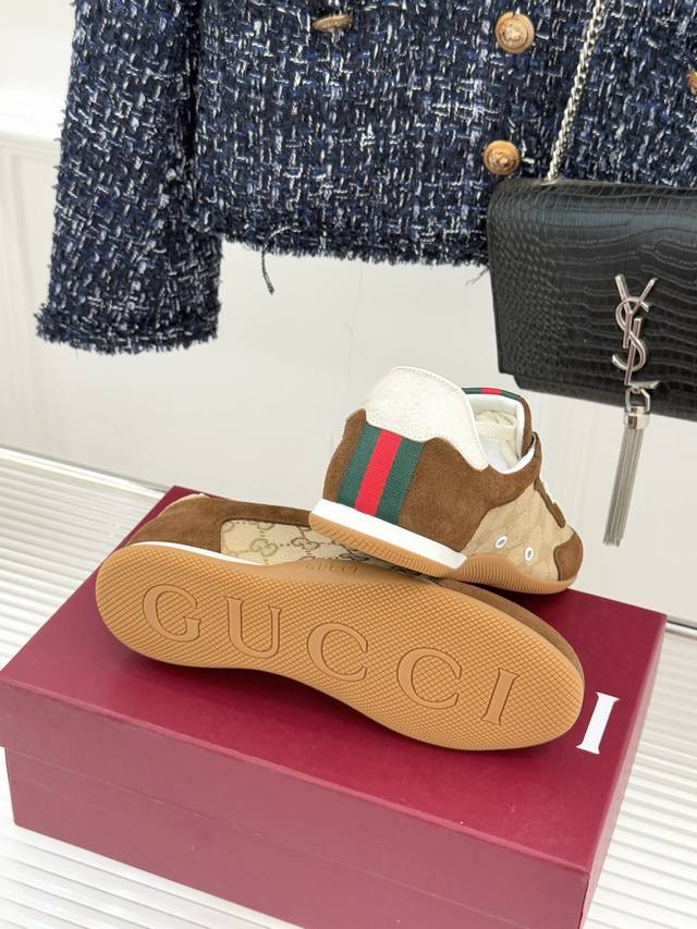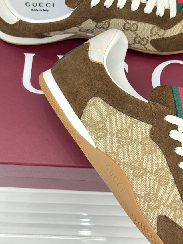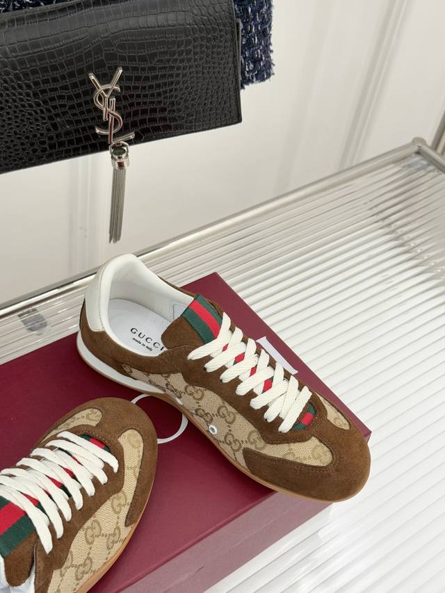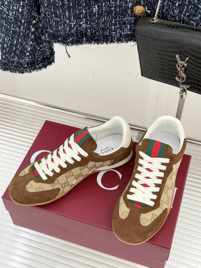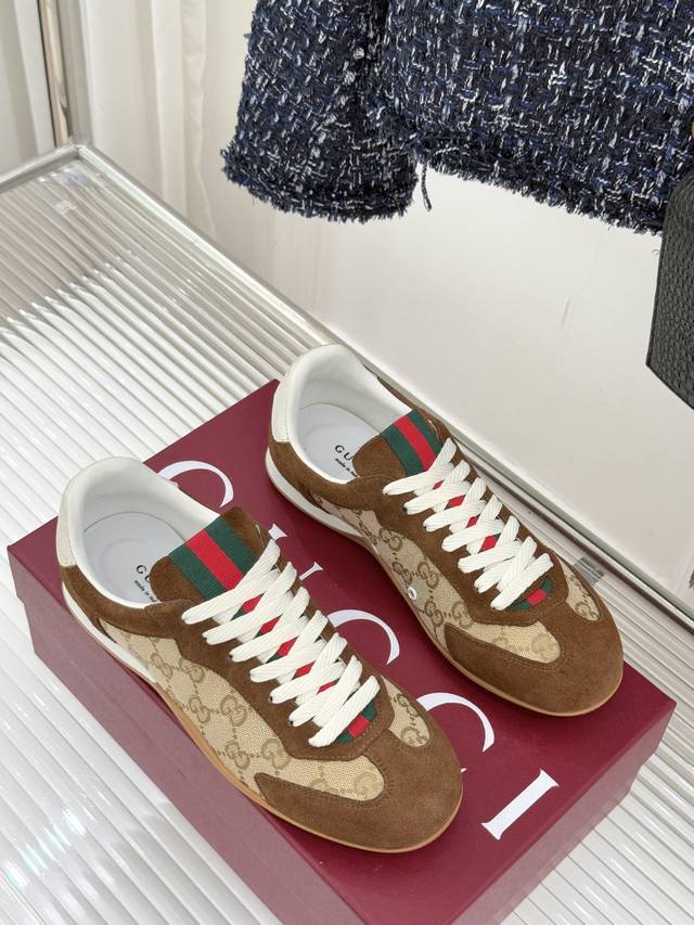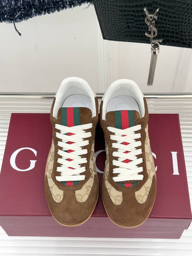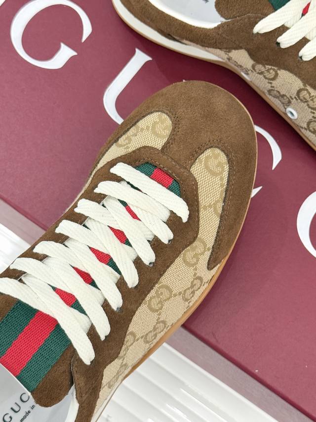 工厂P价 女装女鞋 运动原单 Gucci 古驰25Wf新品彩虹织带休闲德训鞋 当70年代运动基因遇上大胆色彩表达 这款休闲德训鞋以革新姿态重塑经典 让每一步都踏在潮流与舒适的平衡点上。 鞋型延续德训鞋的简约廓形, 线条流畅利落,自带复古滤镜, 而织带元素则以彩虹新貌焕活设计 打破传统红绿织带的固有印象, 成为视觉焦点的同时 亦是个性态度的无声宣言鞋面甄选优质皮革与透气面料拼接 触感细腻温润,搭配加宽鞋头设计, 包容各种脚型,让双脚自在舒展。 让日常穿搭在舒适中绽放独特锋芒。 内里踮脚均为羊皮 原版开模定制