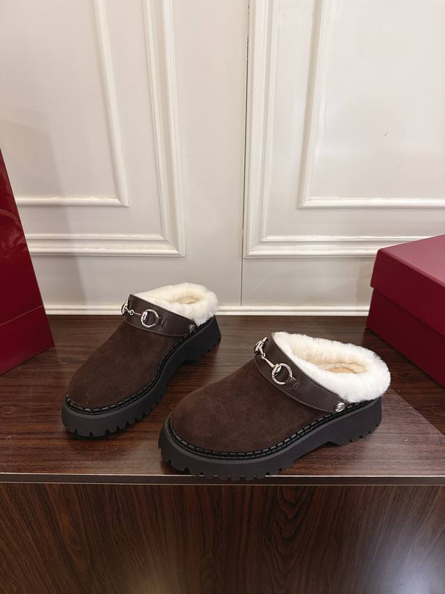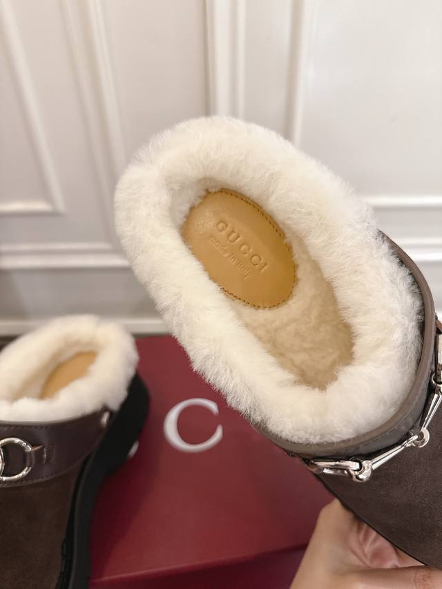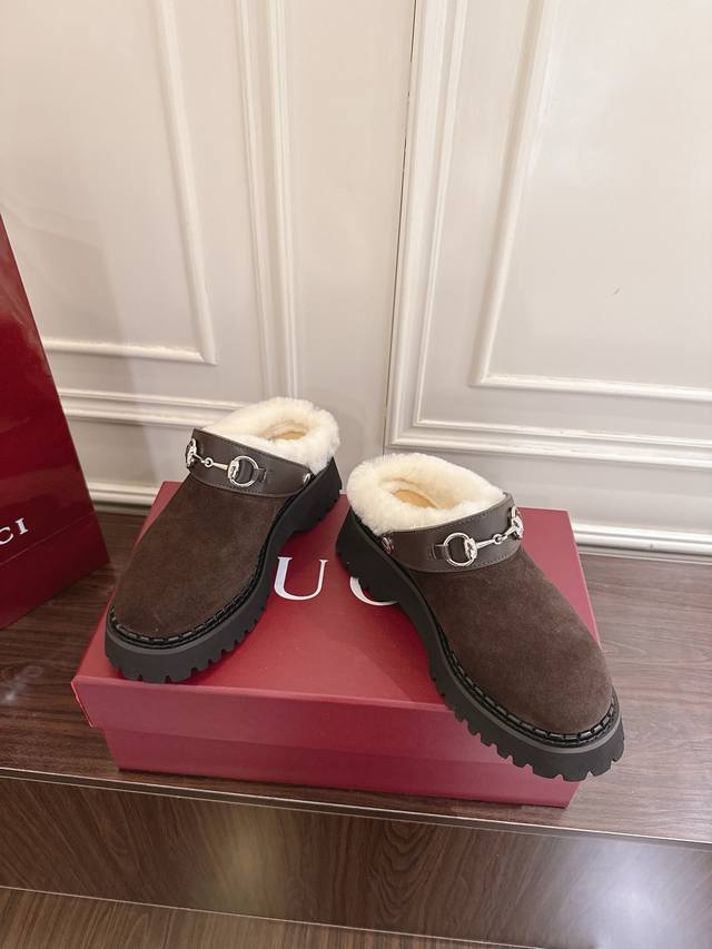 工厂P价 女装女鞋 运动原单 Gucci 饰马衔扣羊毛穆勒鞋沟纹底半拖 作为品牌对马术本源的致敬之作,马衔扣历经岁月洗礼之后,将厚重历史底蕴和现代时尚流行融合形成一体 牛皮面 底厚5Cm 码数35~40