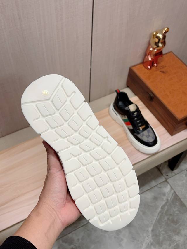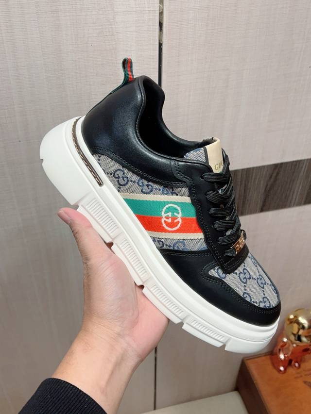 新款: 厂价 古奇Gucci* 最新爆款休闲鞋,顶端品牌 奢侈~代购,顶级~质量。 鞋面選用进口透气牛皮搭配布材质透气羊皮垫脚 精细做工。原版个性时尚柔软橡膠耐