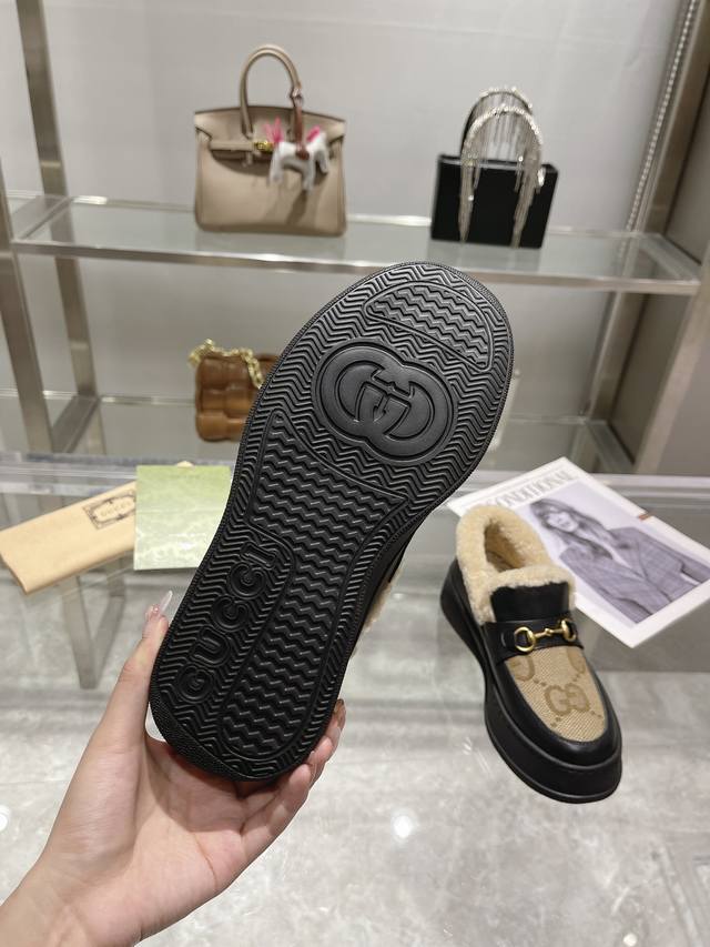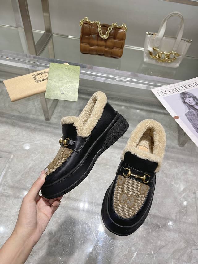 Gucci巴黎时装周中国22年美丽奴羊皮毛一体浅口雪地靴,提花面料Logo头层牛皮澳洲进口羊毛内里, Gucci 这款雪地靴结合了品牌两大标志性元素 金色马衔扣