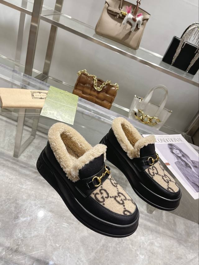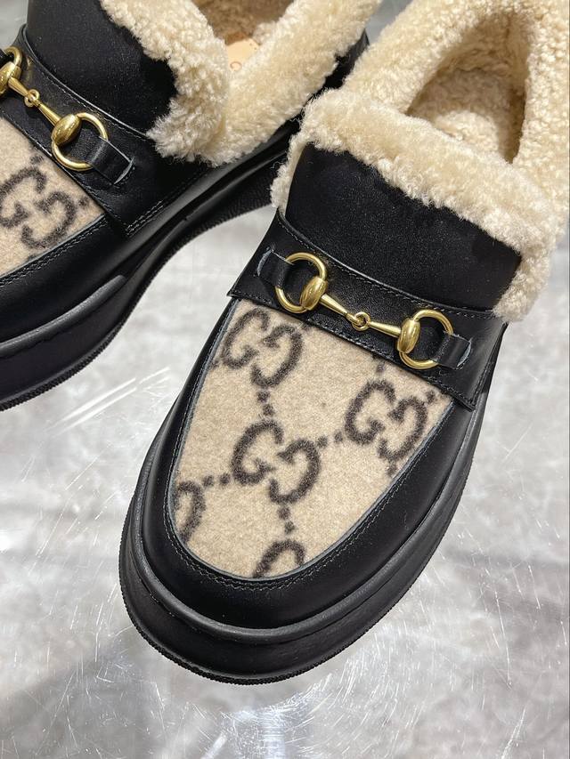 Gucci巴黎时装周中国22年美丽奴羊皮毛一体浅口雪地靴,提花面料Logo头层牛皮澳洲进口羊毛内里, Gucci 这款雪地靴结合了品牌两大标志性元素 金色马衔扣