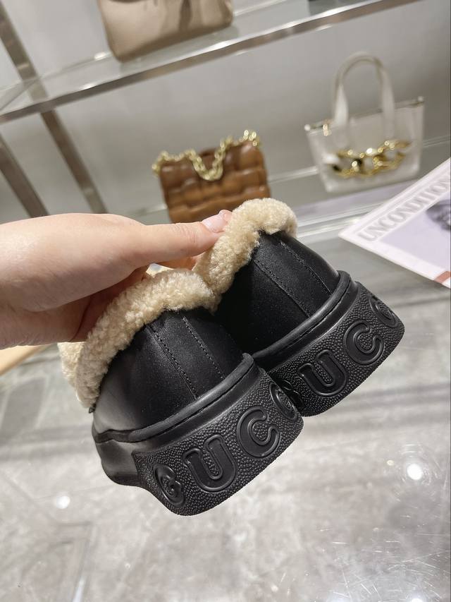 Gucci巴黎时装周中国22年美丽奴羊皮毛一体浅口雪地靴,提花面料Logo头层牛皮澳洲进口羊毛内里, DDD Gucci 这款雪地靴结合了品牌两大标志性元素 金色马衔扣五金和 V 字形马特拉塞绗缝。它采用混纺羊毛毡于意大利制成,以柔软皮革饰边,米黄色羊毛皮全衬里让双足保持温暖。橡胶厚底上压印有 Logo,可提供出色抓地力。 DDD 鞋跟高约 3 厘米 DDD 金典色皮革 小牛皮 ,米黄色羊毛皮内里, DDD 套穿款 DDD 意大利制造 DDD 符合标准尺码,请选择平时所穿尺码 DDD 中国尺码35~42码