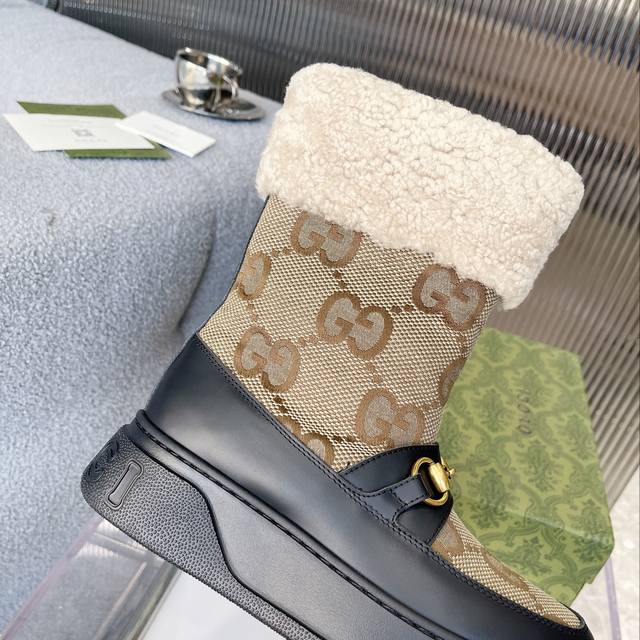 Gucci巴黎时装周中国22年美丽奴羊皮毛一体雪地靴,提花面料Logo头层牛皮澳洲进口羊毛内里, DDD Gucci 这款雪地靴结合了品牌两大标志性元素 金色马衔扣五金和 V 字形马特拉塞绗缝。它采用混纺羊毛毡于意大利制成,以柔软皮革饰边,米黄色羊毛皮全衬里让双足保持温暖。橡胶厚底上压印有 Logo,可提供出色抓地力。 DDD 鞋跟高约 3 厘米 DDD 金典色皮革 小牛皮 ,米黄色羊毛皮内里, DDD 套穿款 DDD 意大利制造 DDD 符合标准尺码,请选择平时所穿尺码 DDD 中国尺码35~42码 D