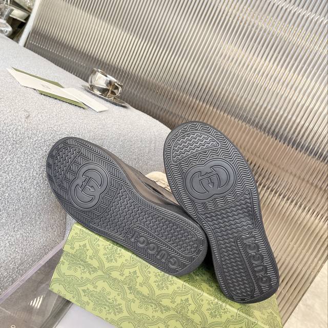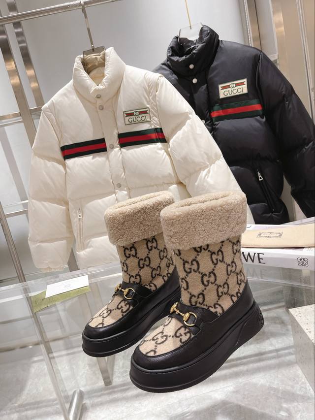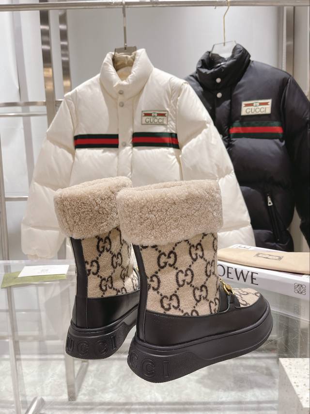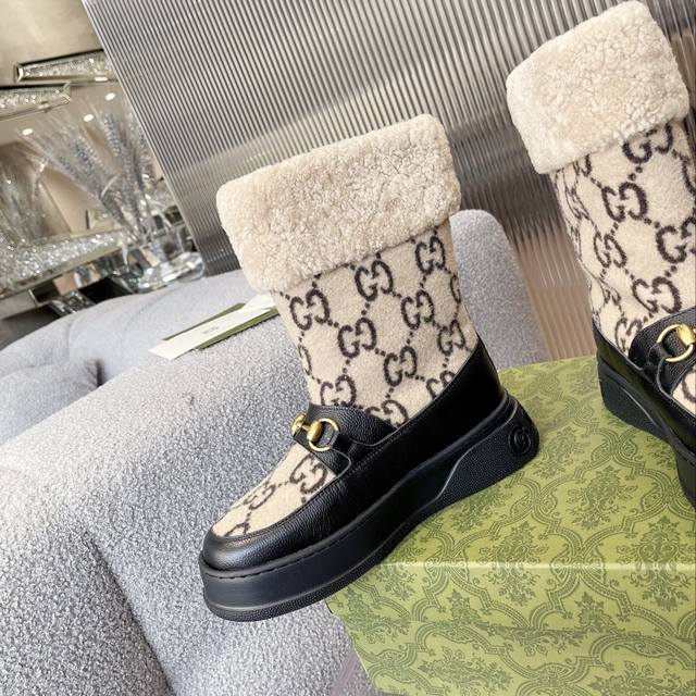 Gucci巴黎时装周中国22年美丽奴羊皮毛一体雪地靴,提花面料Logo头层牛皮澳洲进口羊毛内里, Gucci 这款雪地靴结合了品牌两大标志性元素 金色马衔扣五金