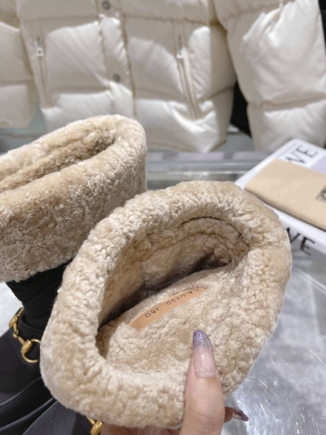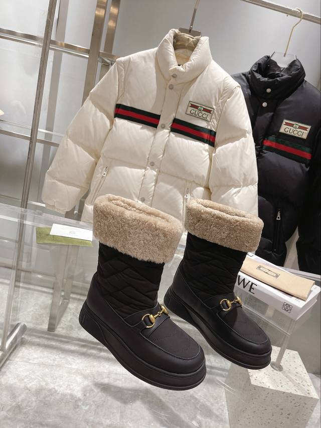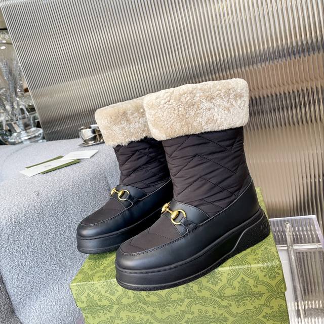 Gucci巴黎时装周中国22年美丽奴羊皮毛一体雪地靴,提花面料Logo头层牛皮澳洲进口羊毛内里, Gucci 这款雪地靴结合了品牌两大标志性元素 金色马衔扣五金