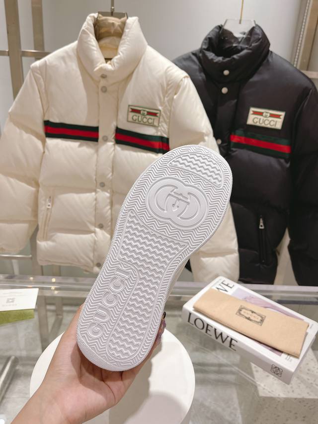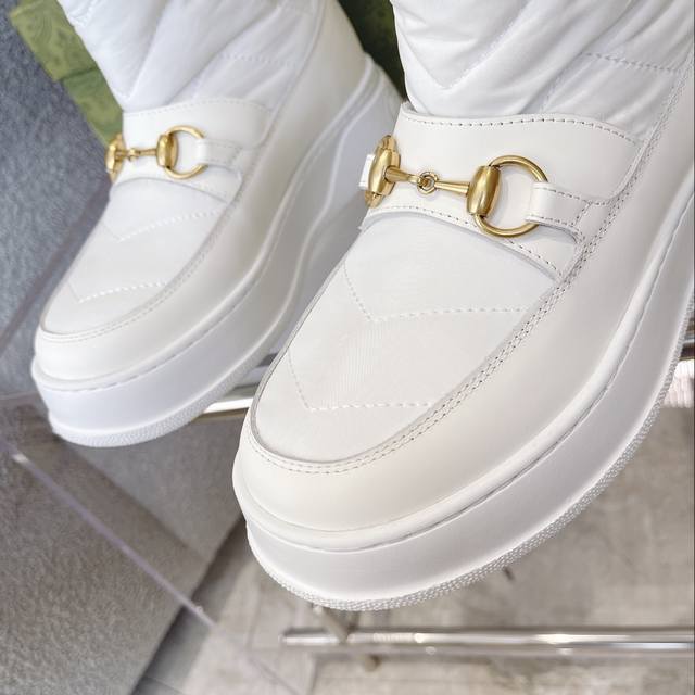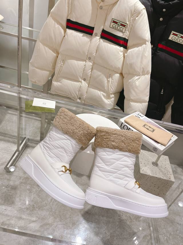Gucci巴黎时装周中国22年美丽奴羊皮毛一体雪地靴,提花面料Logo头层牛皮澳洲进口羊毛内里, Gucci 这款雪地靴结合了品牌两大标志性元素 金色马衔扣五金