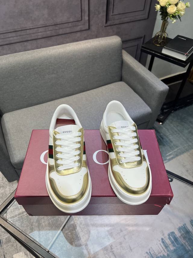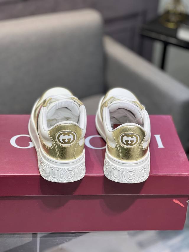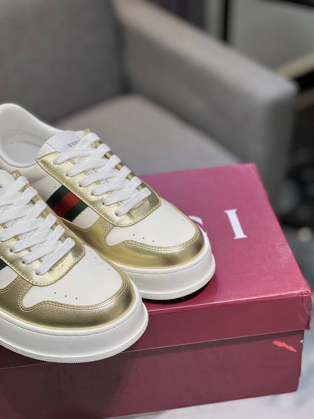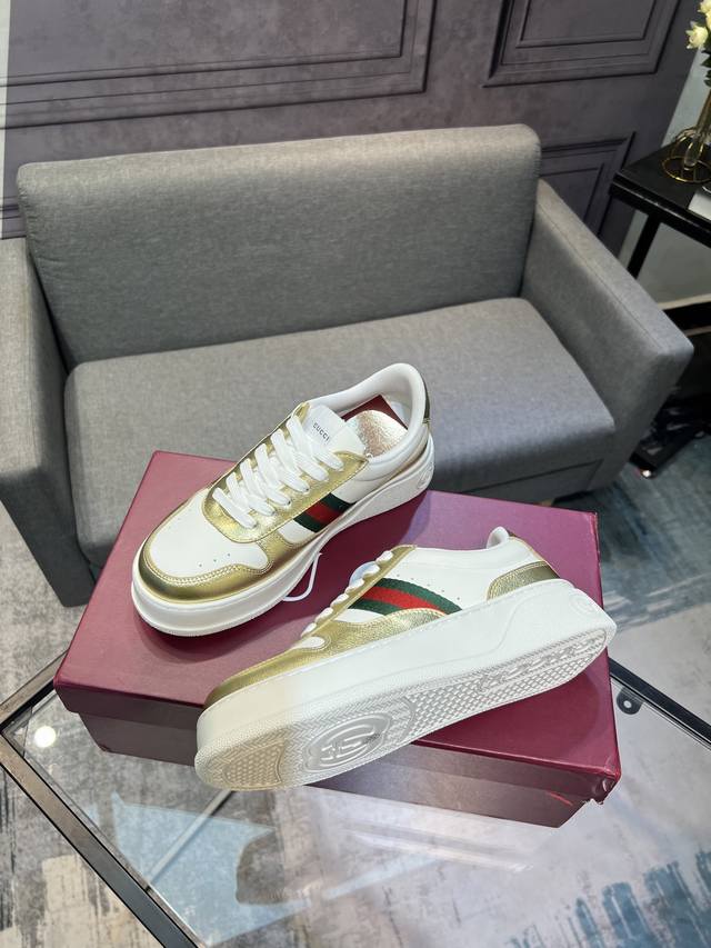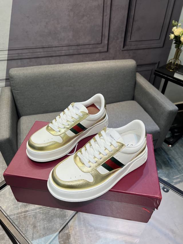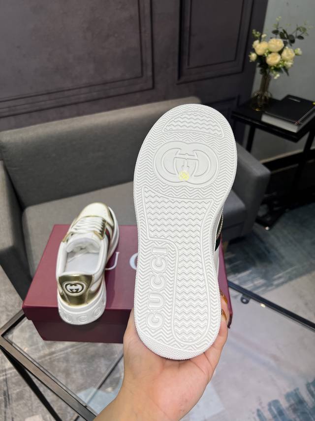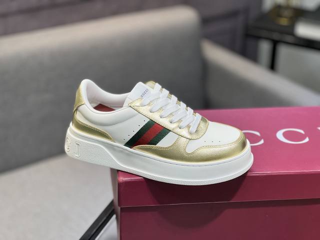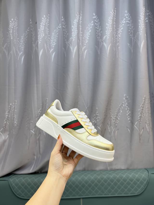 / Gucci 专柜最新情侣款饼干鞋 代购级别 Gucci 最新Ip轻质厚底小白鞋上脚秒内**4Cm!!简约 好搭且复古韵味十足~鞋舌最新防伪布标。且带电子芯片防伪
