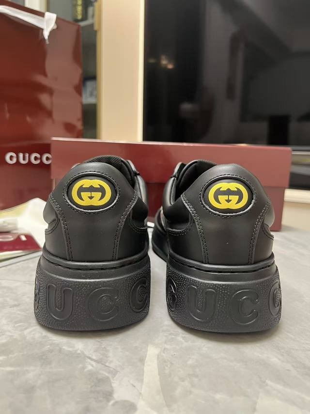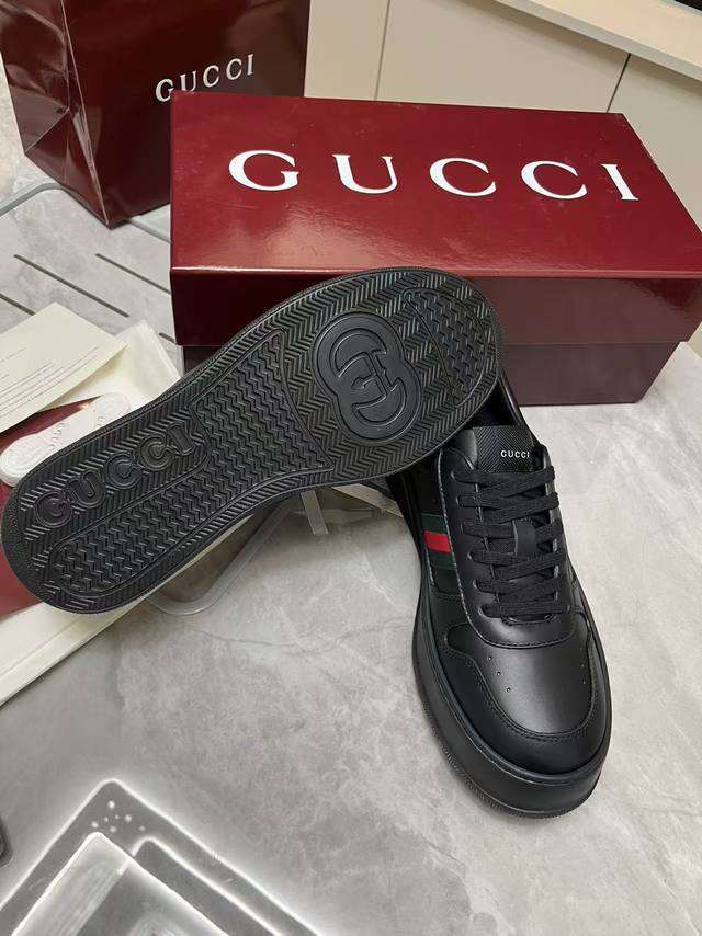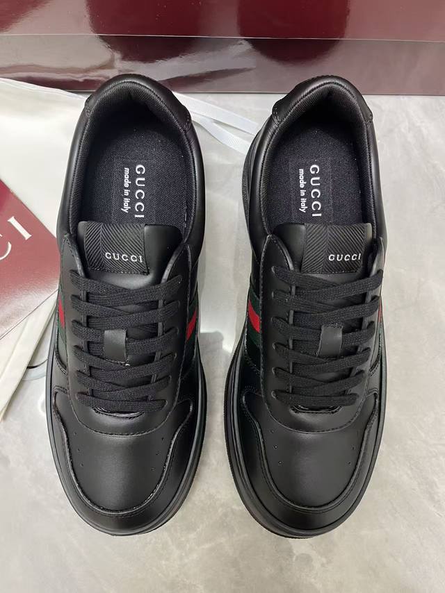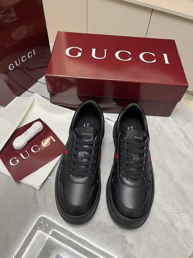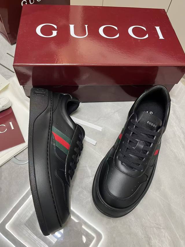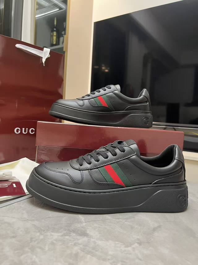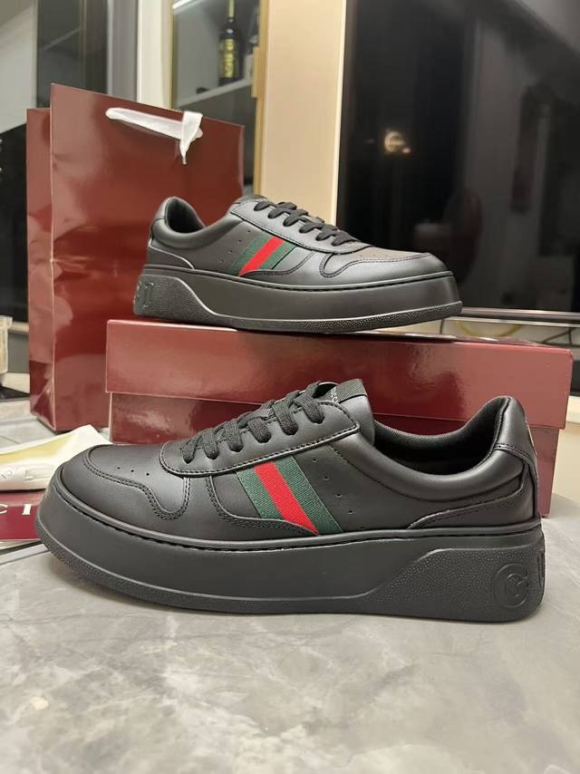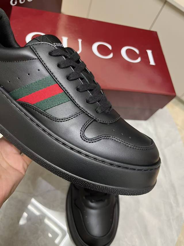 Gucci 厚底休闲鞋|型格与奢华的碰撞 当经典红绿织带邂逅质感皮革,每一双都演绎出别样风格。黑白撞色的酷飒、纯白款的简约、金白的吸睛、银白的摩登,还有全黑的低调奢华,厚底设计更添潮流感,无论是日常出街还是精致穿搭,都能让你在时尚圈轻松站稳C位,尽显Gucci式的优雅与个性。 面料:原板牛皮 垫脚:原板双G垫 大底:Ip发泡 鞋舌码数:空压原码 包装:精品全套配手提袋 备注:所有细节均有原板对比 配码: 男39-45