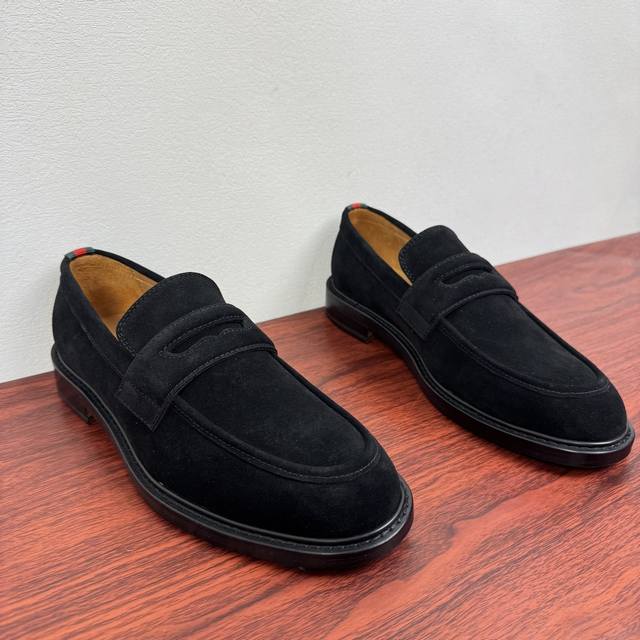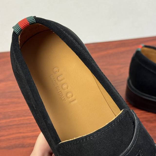 Gucci 古驰 新款男士纯色皮革乐福鞋! Ddd 这款优雅乐福鞋采用柔软绒面牛皮革制成 两重风格可选。鞋面搭配真皮扣带装饰 增添低调而别致的标识图案元素 简约风格设计 经典欧美楦型 标配风格 后跟有红绿织带装饰点缀品牌风格细节。甄选优质皮料 质感做工材质看细节 本染小牛皮内里 皮孔均匀细腻,柔软舒适 加厚真皮大底,后跟复合橡胶底片,上脚舒适度极好,且耐磨防滑,轻奢首选佳品,上脚百搭,配全套包装! Ddd 尺码:39-40-41-42-43-44皮鞋尺码 可定制38.45.46 Ddd 货号:812168