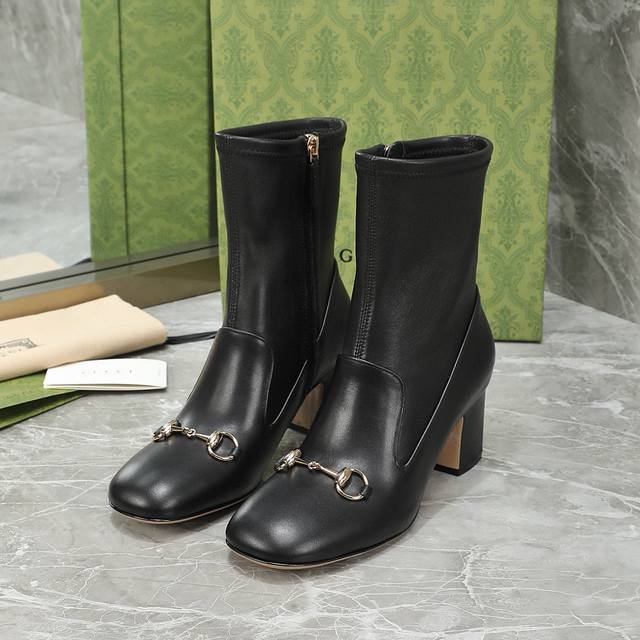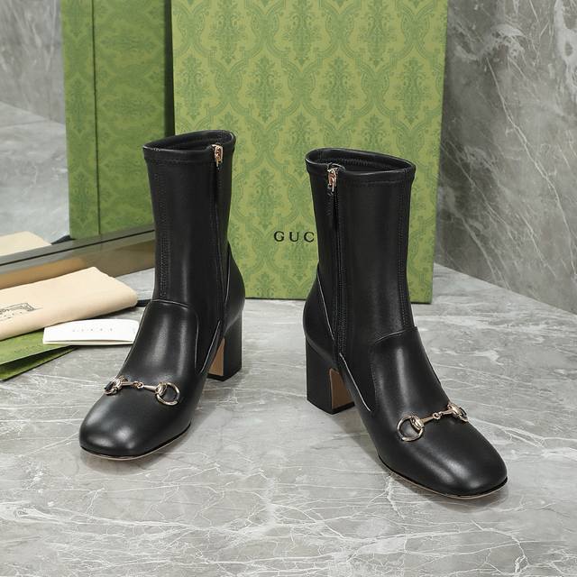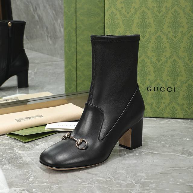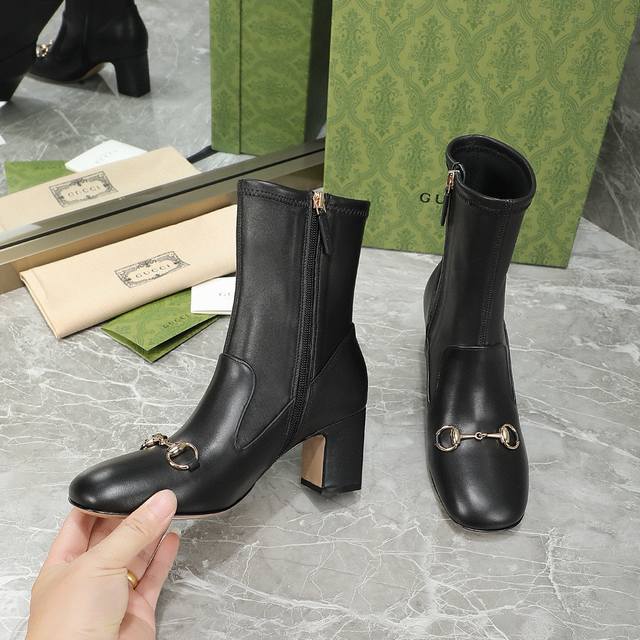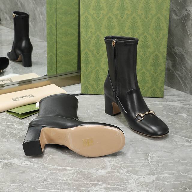 Gucci 古驰 秋冬款马衔扣短靴 经典的1955马衔扣 极简设计 没有一丝一毫的多余 半弧方形鞋头 饱满有型 整个鞋子的线条感是非常柔和的 弧度贴合脚型 面料:进口小牛皮+弹力羊皮 内里:羊皮 大底:意大利真皮大底 跟高:6.5 9.5 码数:35-40 41 42订制