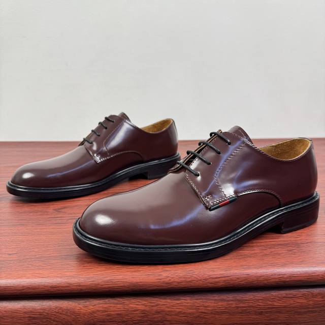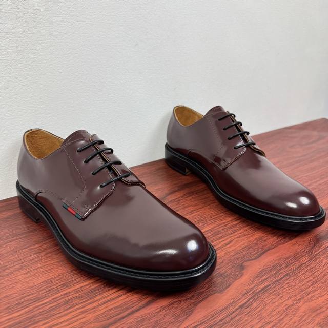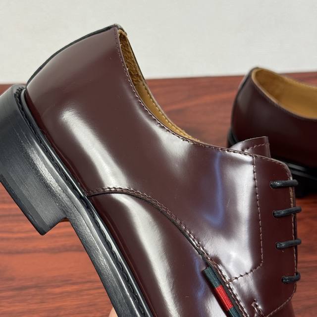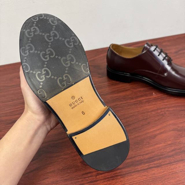 Gucci 古驰 秋季新款男士系带德比鞋! 这款系带鞋甄选光滑亮面牛皮革打造,匠心融蕴优雅精致的廓形,彰显品牌经典优雅风范。欧版楦型 整块皮革精准剪裁鞋面 优质