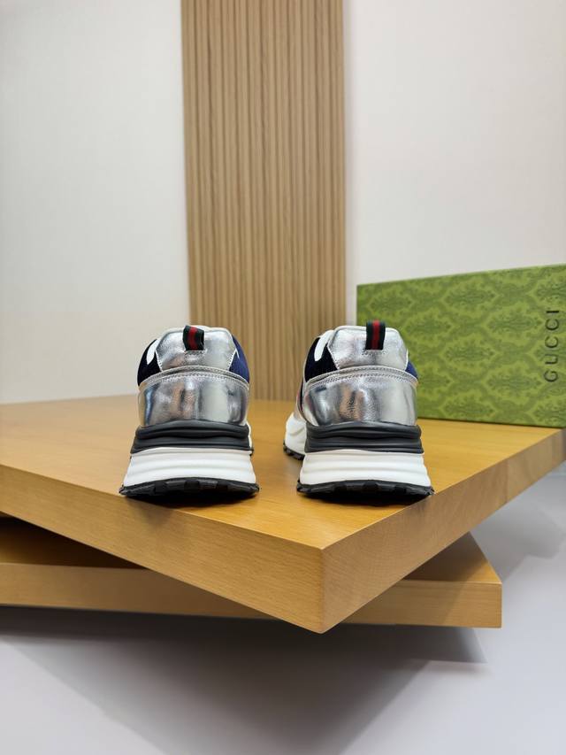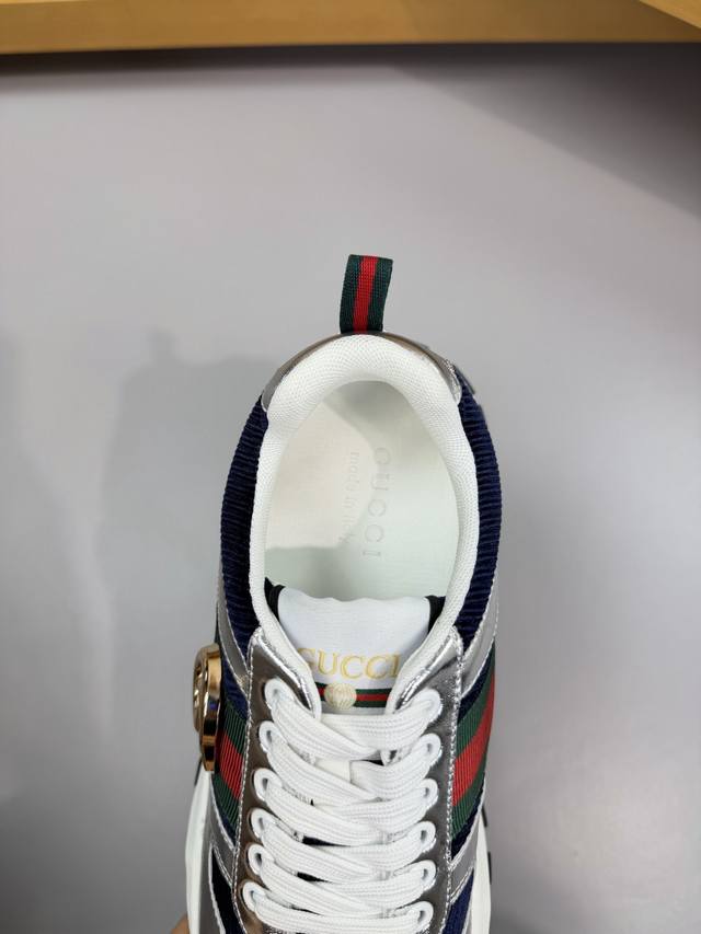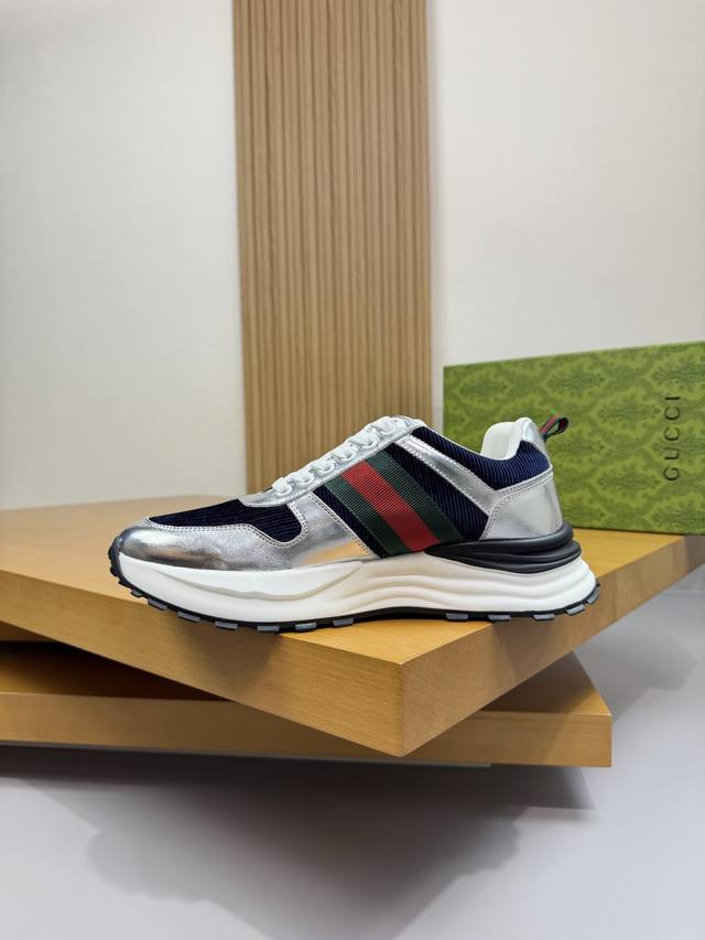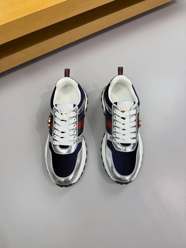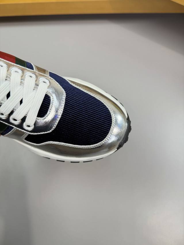 Gucci 古驰 -高端品质 原单 休闲运动鞋 -鞋面:银色小牛皮、品牌灯芯绒布匹、鞋身品牌织带.金属扣件 -内里:品牌帆布,垫脚;水染牛皮 -大底:超轻Tpu