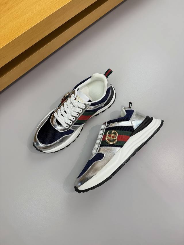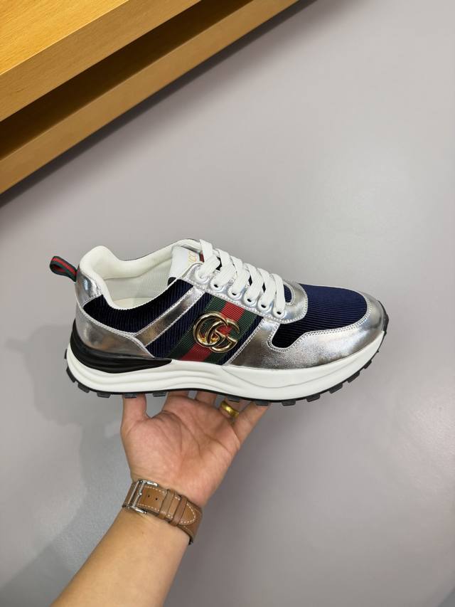 Gucci 古驰 -高端品质 原单 休闲运动鞋 -鞋面:银色小牛皮、品牌灯芯绒布匹、鞋身品牌织带.金属扣件 -内里:品牌帆布,垫脚;水染牛皮 -大底:超轻Tpu发泡.橡胶;成型大底 -超高品控 做工精细:凸显 高端 贵气 档次 -Size: 39-44 38,45,可订做 G0186