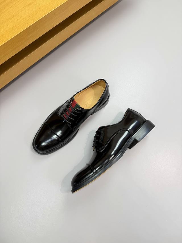 Gucci 古驰 -高端品质 原单 正装皮鞋 -鞋面:开边珠小牛皮、鞋舌品牌织带装饰 -内里:水染牛皮 -大底:超轻Tpr 橡胶;组合成型大底 -超高品控 做工精细:凸显 高端 贵气 档次 -Size :39-44 38,45,可订做 H0225