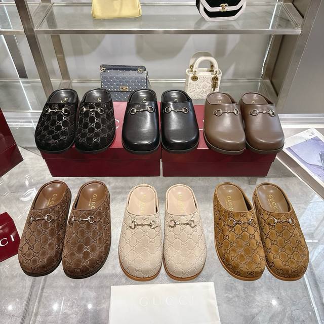 / Gucci 女款:女码:36-42码 新款牛皮反绒马衔扣女士裸脚拖鞋 Gg在 2025 早秋系列中继续使用档案符号。Horsebit 硬件让人想起品牌的马术传统