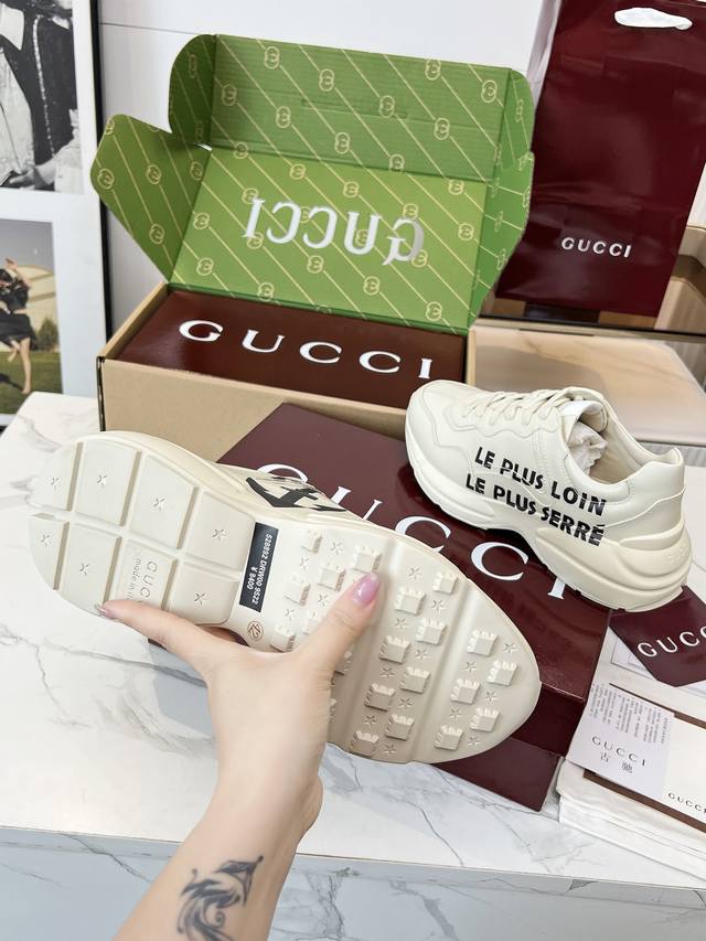 Gucci 老爹鞋,踩出你的奢华宣言 厌倦了千篇一律?渴望在人群中脱颖而出?Gucci 老爹鞋;正是你衣橱里缺失的那件风格利器! 经典重塑,复古回潮:汲取 年代复古灵魂,注入 Gucci 当代美学基因。标志性的厚实廓形、大胆线条与层次感设计,瞬间唤醒你的复古潮流Dna,成为街头绝对的视觉焦点。 双G荣耀,无处不在:无处不在的经典双G标识,或醒目点缀,或低调融入鞋身细节。这不仅是品牌象征,更是你不凡品味与身份的无声宣告。穿上它,每一步都自带光环。 奢华材质,匠心工艺:Gucci 从不妥协于品质。甄顶级皮革、