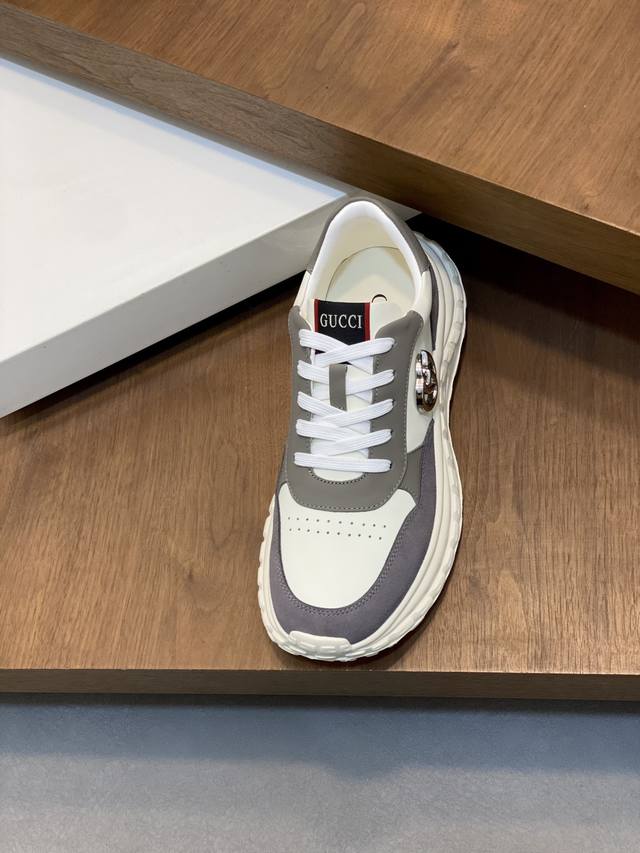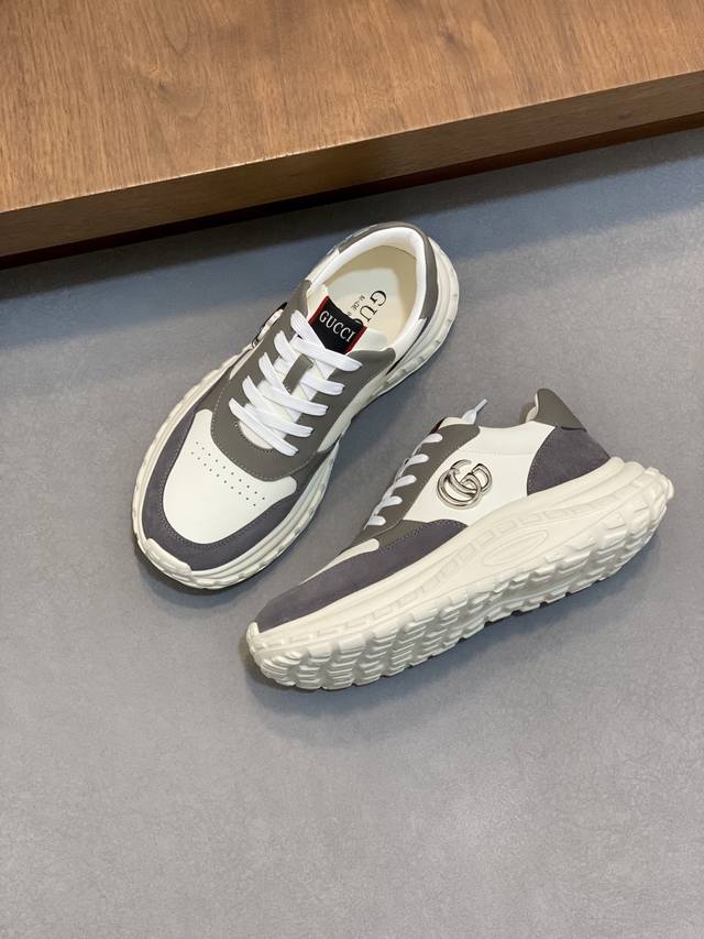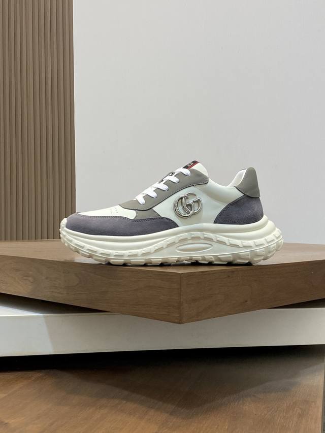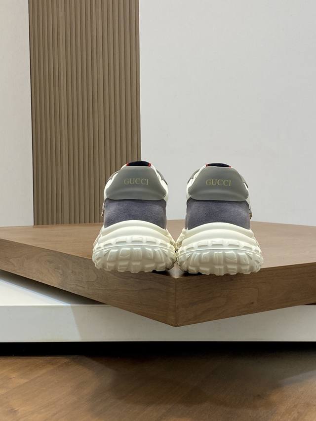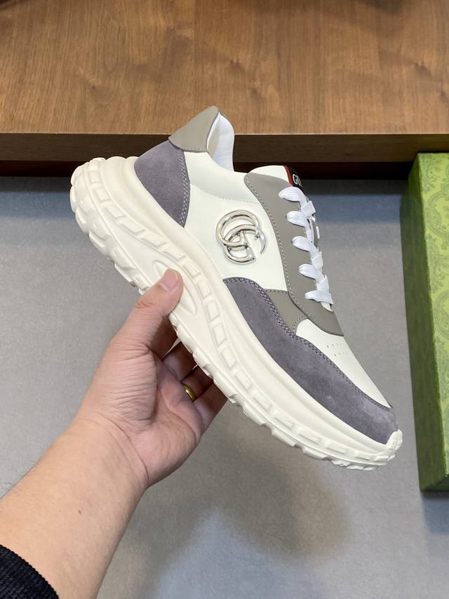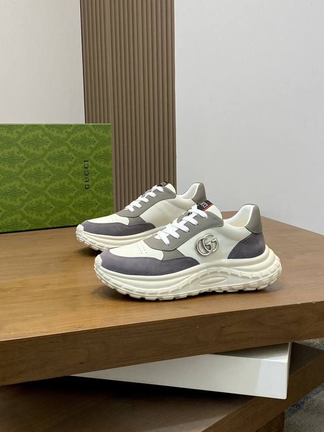 / Gucci Rhyton系列运动鞋,牛皮拼接,经典双G金属标志+红绿织带,品牌感满满。厚底橡胶鞋底,缓震舒适,适合日常穿搭或轻运动。鞋面透气,脚感好,黑色百搭又