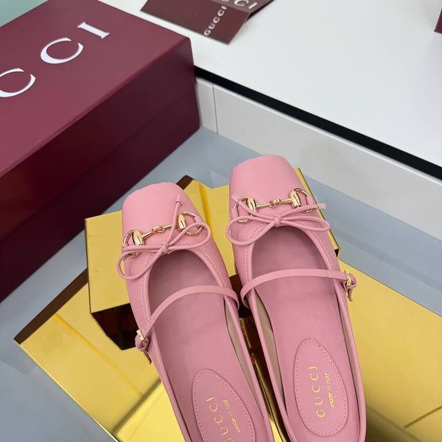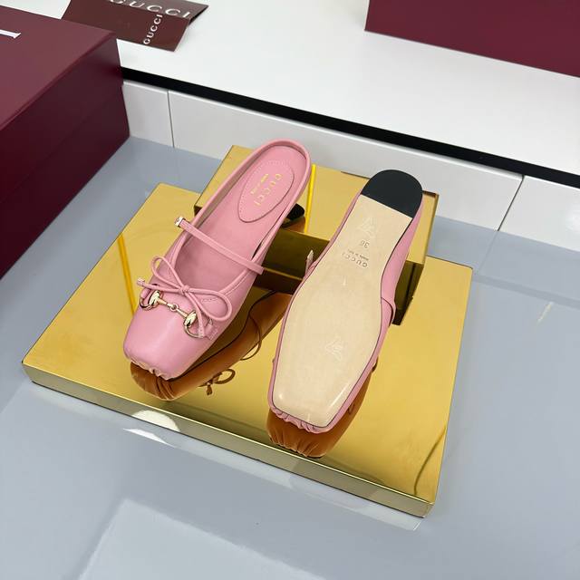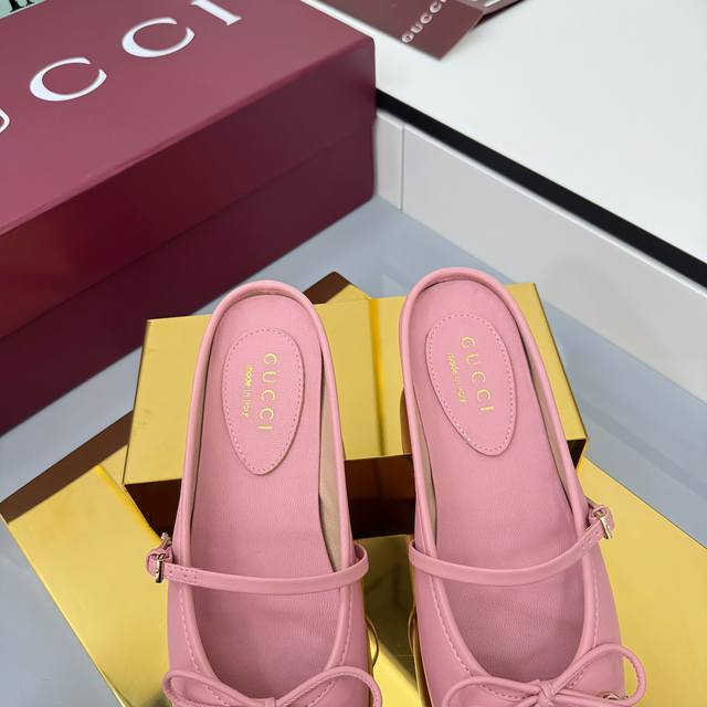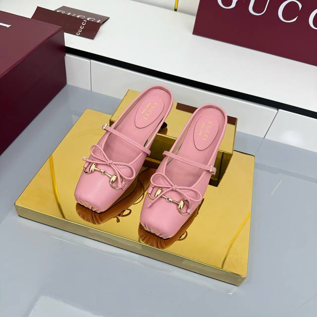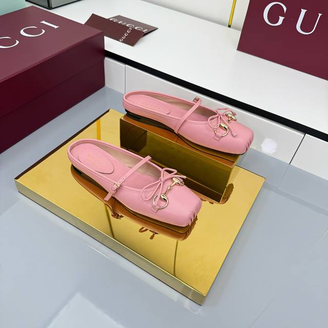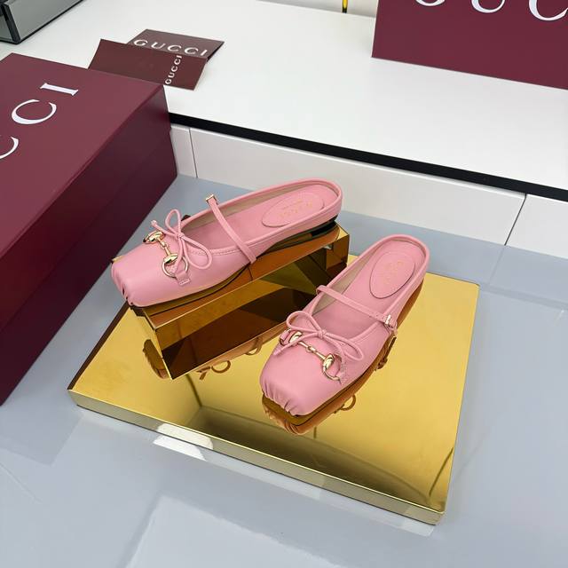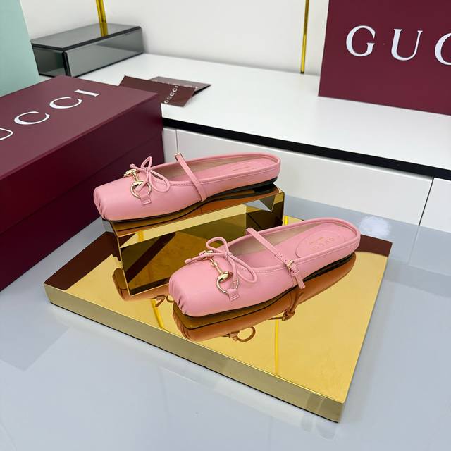 Gucci2025秋冬系列, 这款马衔扣平底芭蕾穆勒鞋选用方形收口鞋头设计,搭配雅致的蝴蝶结细节,致敬传统芭蕾舞鞋款型。这款单品以皮革匠心打造,缀饰浅金色调配件