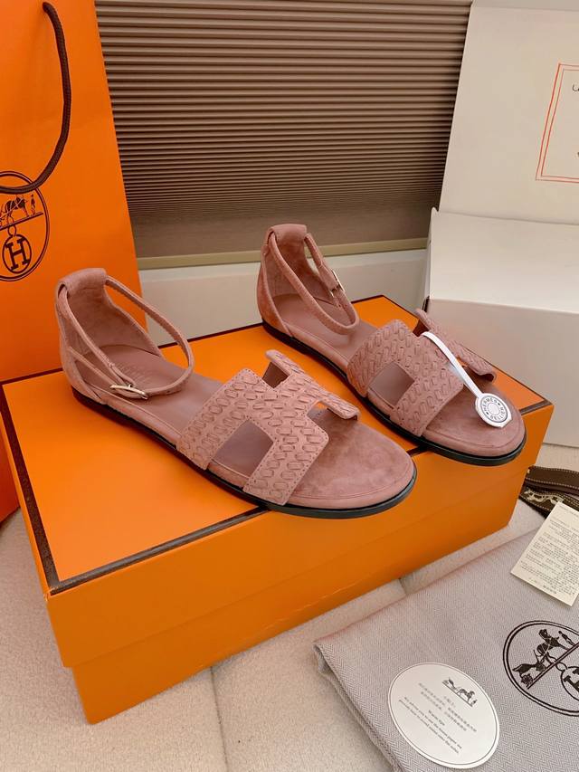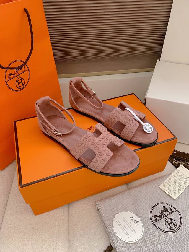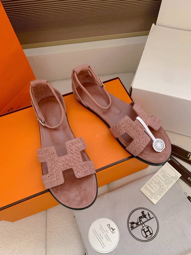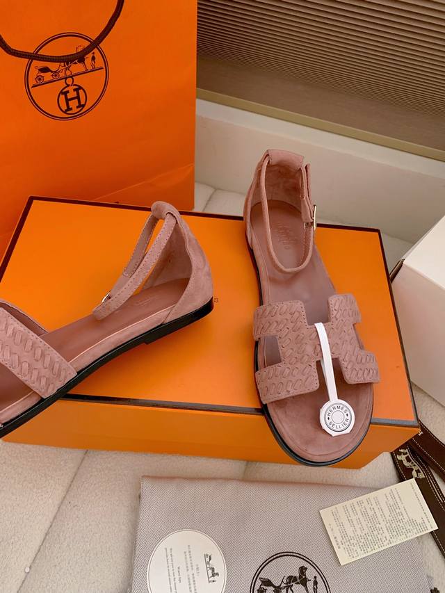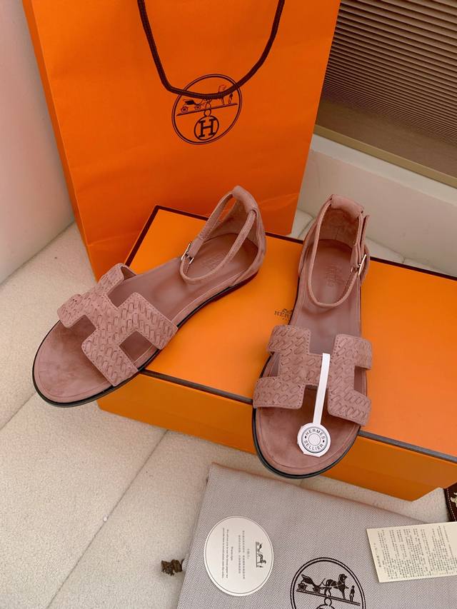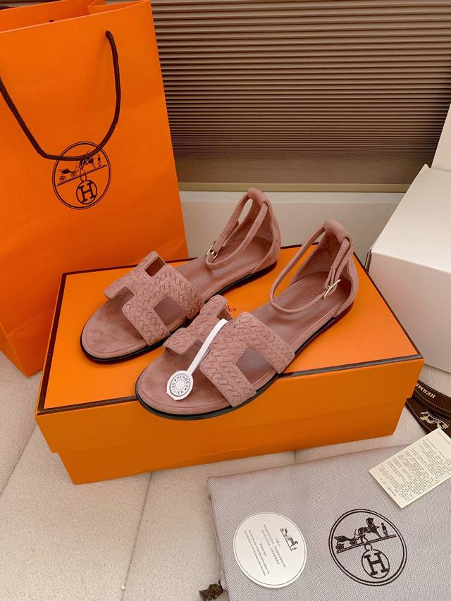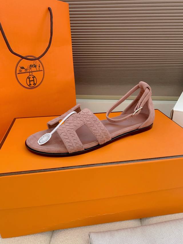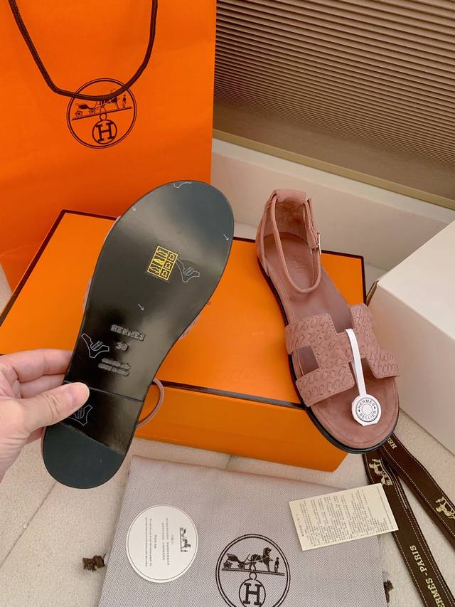 / 出厂价p 、 顶级品质 Hermes 爱马仕 Santorini凉鞋编织麂皮系列 H家 平底凉鞋编织绒面H鞋面中空凉鞋 时尚又百搭 搭配H鞋面 超级舒服 每个细