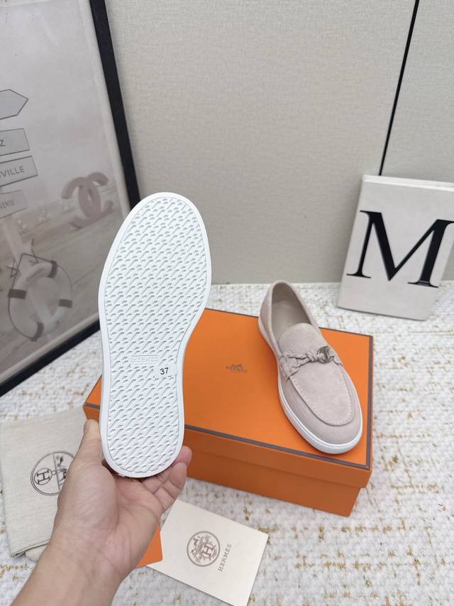 出厂女 男 高版本 Hermes# Lgnacio系列 情侣款 乐福鞋 休闲 运动鞋 原版购入开发 做货 这款小牛皮乐福鞋,饰有皮革编绳和“Chaine D'ancre”鞋扣 时尚航海风格乐福鞋,是陆地和海滨的理想选择 配送专柜精美包装 面料 : 原版定制进口头层牛皮 牛反绒 内里 : 进口柔软羊皮里 鞋底 : 原版开模防滑Tpu材质 底厚 :2Cm 码数:35-45 女40男45定做不退换