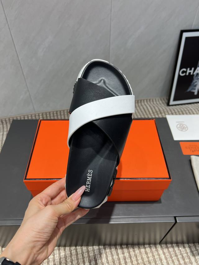 出厂:情侣 独家顶级版本 H家H*Erms 2025春夏新款凉拖系列 情侣沙滩凉拖 我家都是购入Zp开模调楦出货,跟Zp基本上无差上脚无敌秀气,修饰脚型,非常简约大气,春夏搭配裙子裤子也很气质 面料:定制进口牛皮内里:定制羊皮垫脚:定制羊皮大底:原版开模双色发泡大底底高:3Cm包装:原版全套包装码数:35-44 女40.41男38.45定制不退不换 颜色:官网同步更新