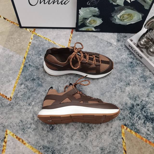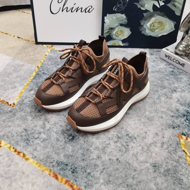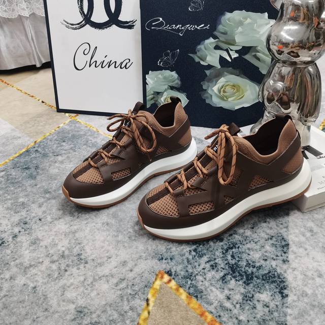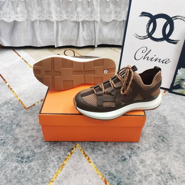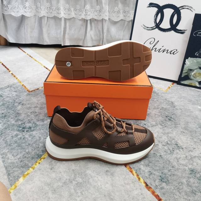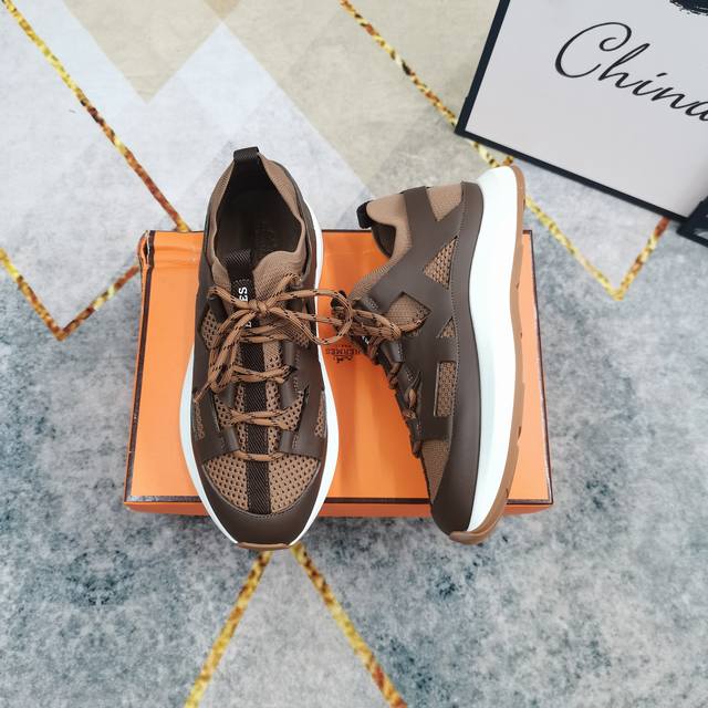 出厂:男 Herme* 2025新款低帮休闲鞋出货 面料:进口网面拼接牛皮 大底:超轻Ip材质 踩棉花脚感 跟高:3.5Cm Size:男39-44 45订做