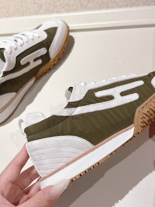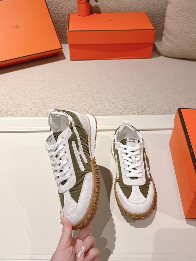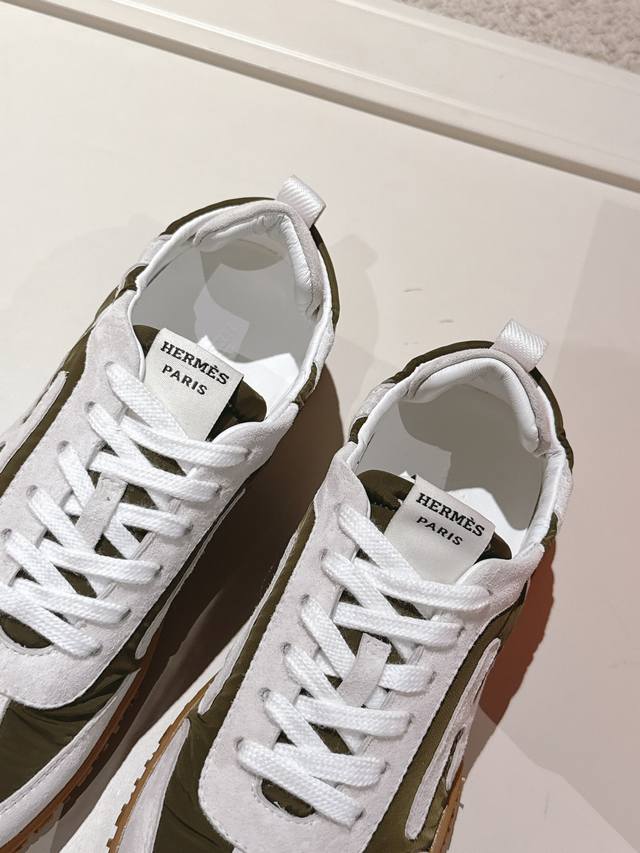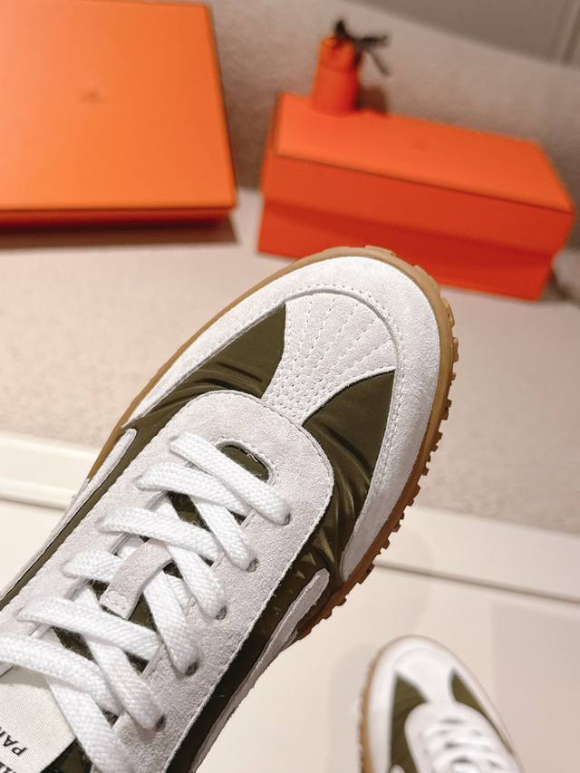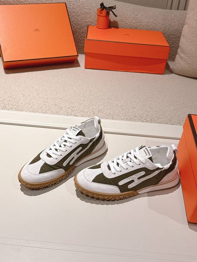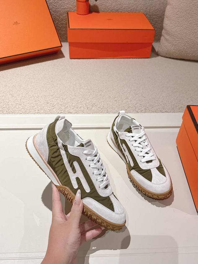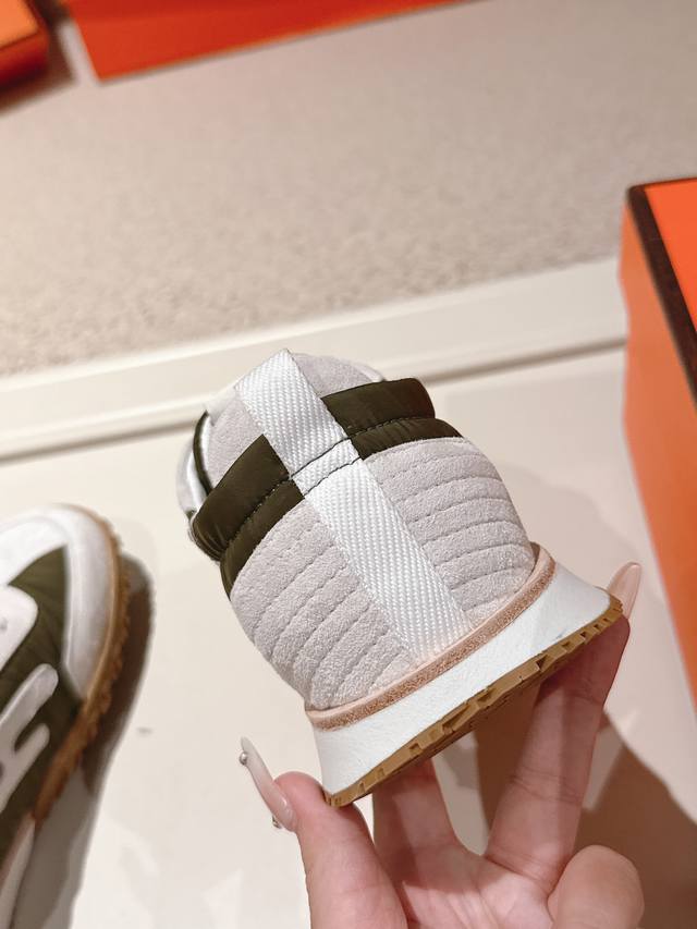 / 女 男390 Hermes 顶级版本# 24Ss休闲运动鞋 麂皮山羊皮运动鞋装饰撞色图案和标志性“H”细节,配送专柜精美包装 面料:麂皮+羽绒布 内里:混种羊里