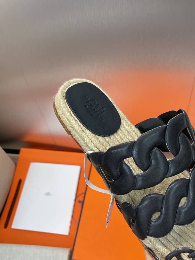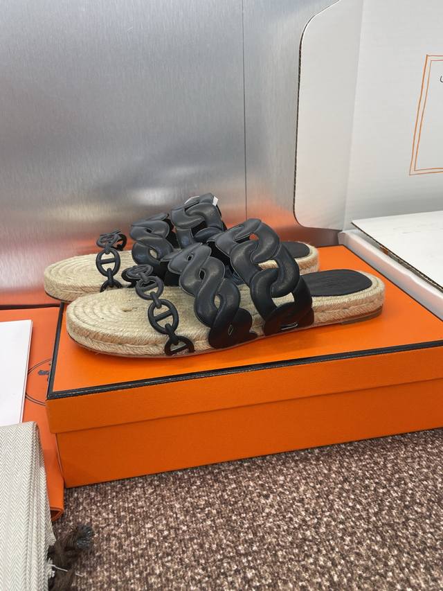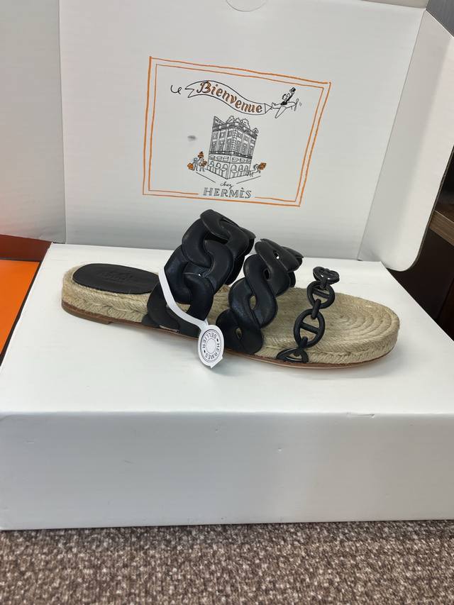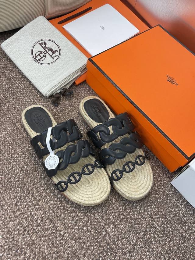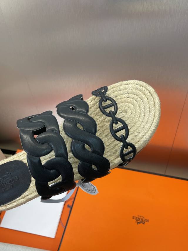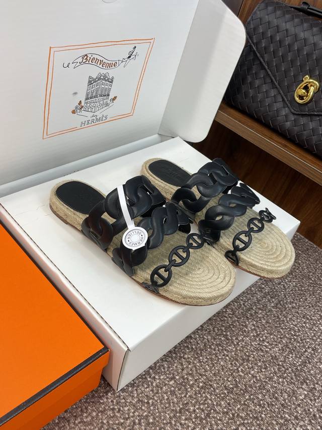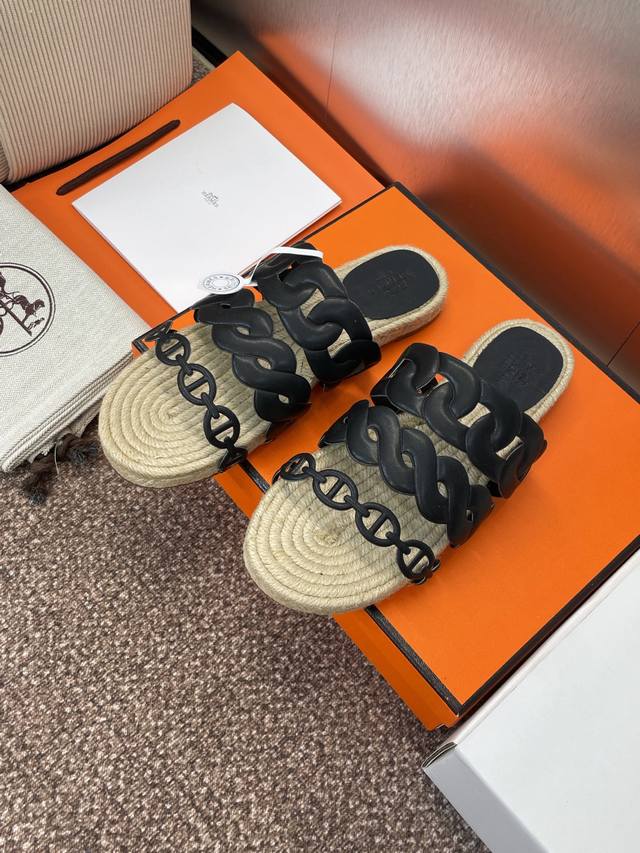 莞货 代购级 爱马仕 Hermes 2025春夏新款 Lagune 系列 Chaine D’Ancre 猪鼻孔链条图案女鞋 H家平跟拼色圆头露趾草编懒人沙滩凉拖鞋