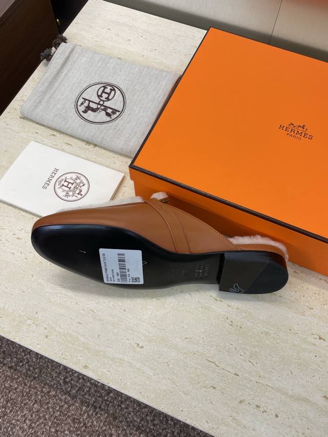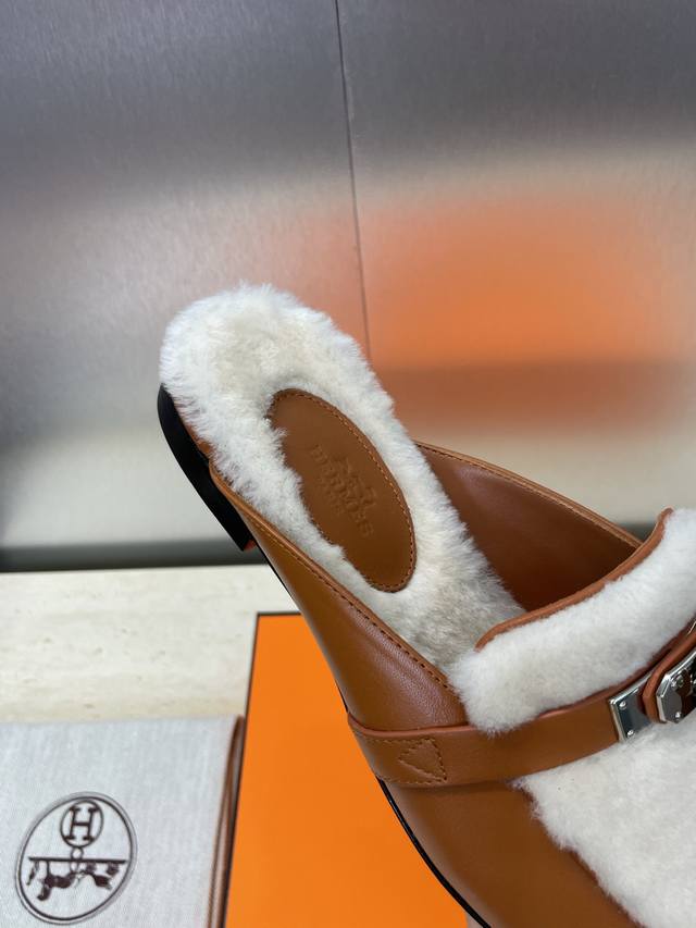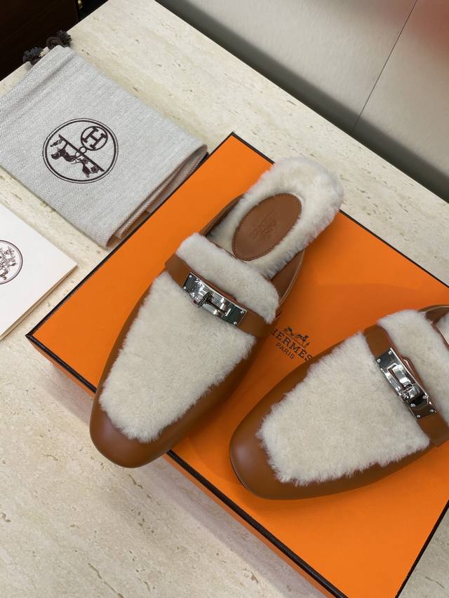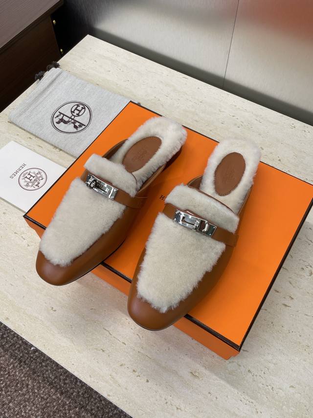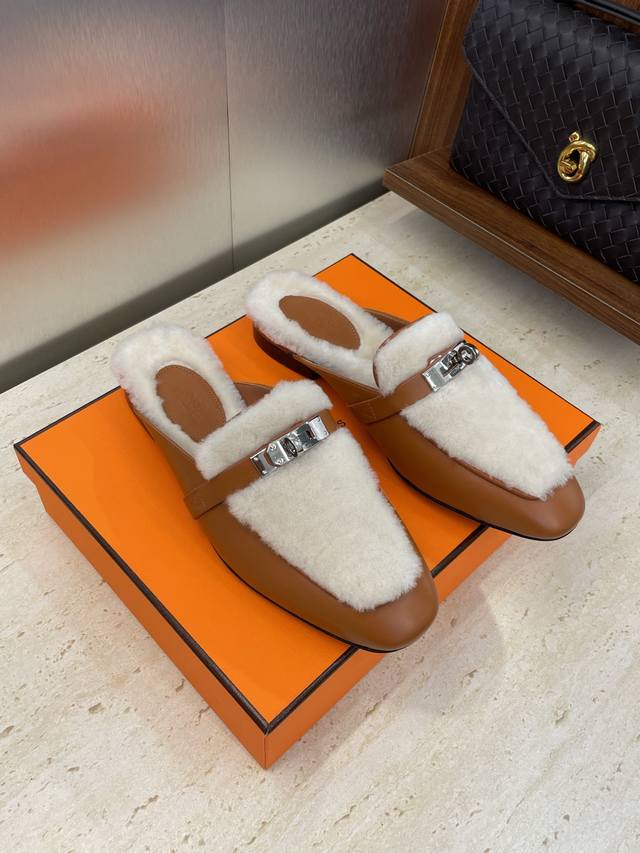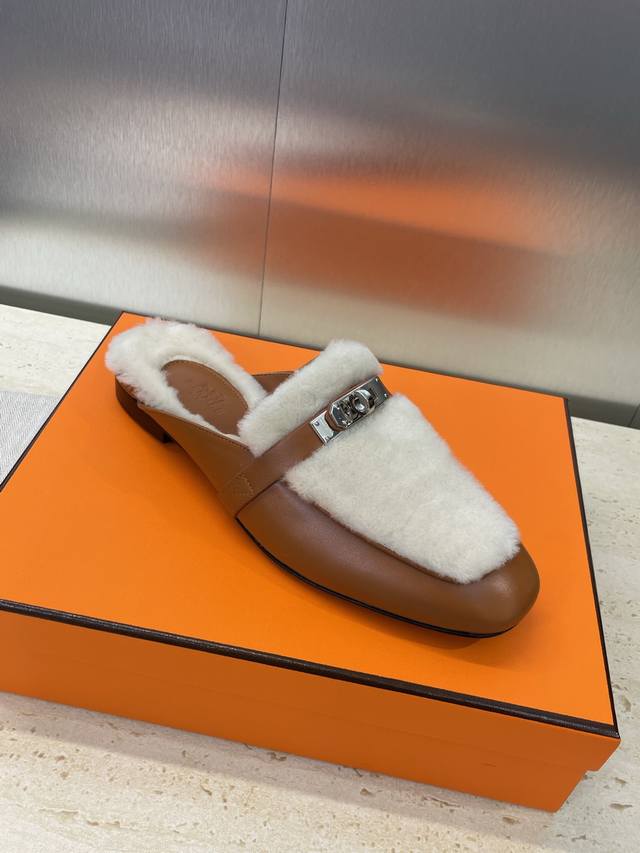工厂P价P 爱马仕 Hermes 2025秋冬经典款 Kelly扣 Oz皮毛一体拼色鞋 H家平底圆头穆勒拖鞋 材质:鞋面进口小牛皮+100%羊羔毛内里+意大利真