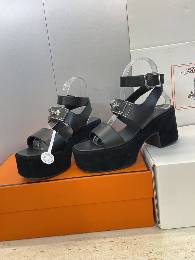 工厂P价P 莞产 代购级 爱马仕 Hermes 2025春夏新款 Kelly扣 Lola拼色粗跟女鞋 H家高跟厚底防水台圆头罗马风交叉带凉拖鞋 材质:鞋面进口小