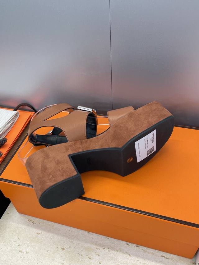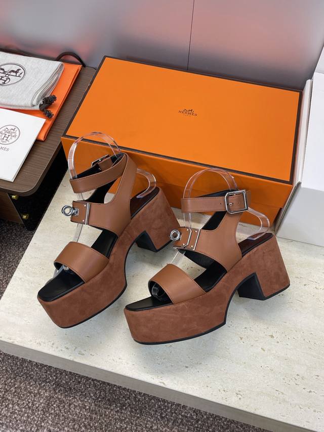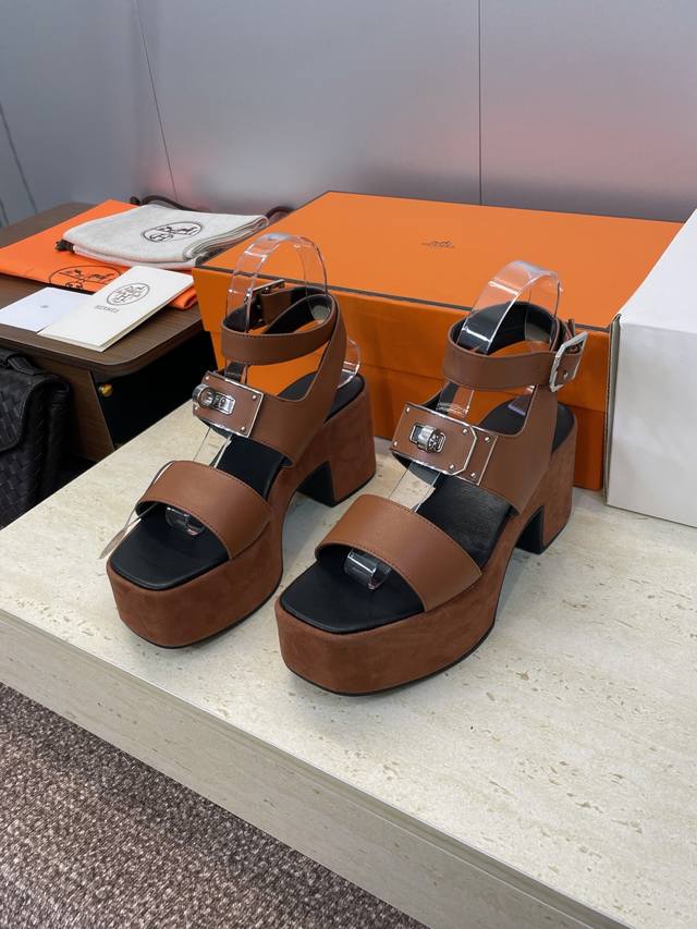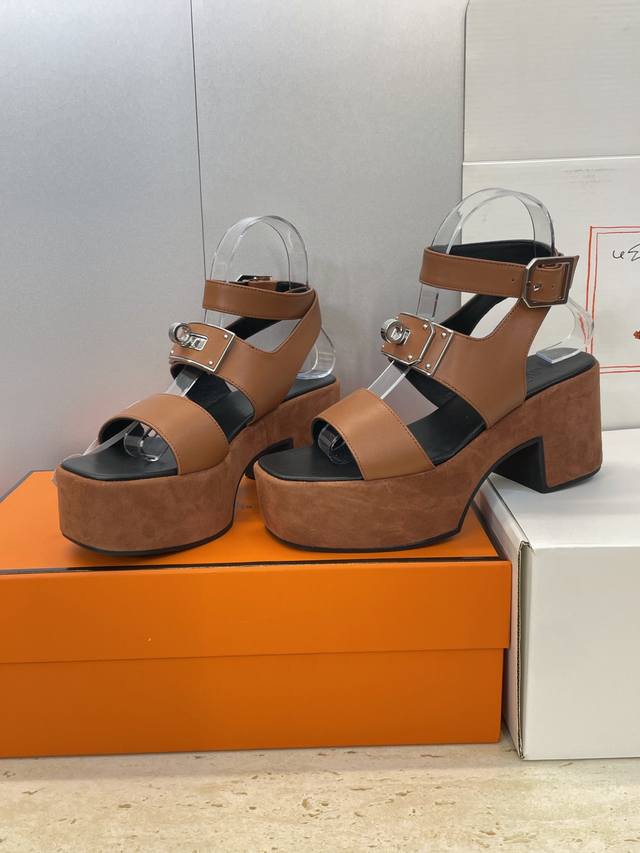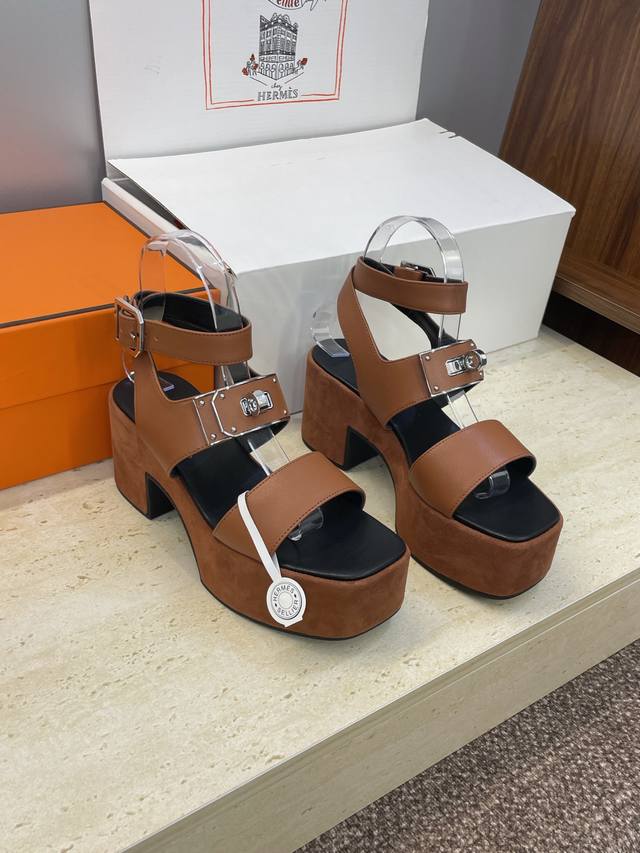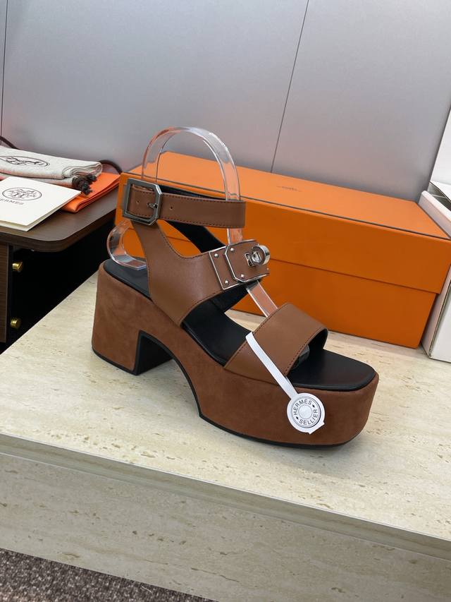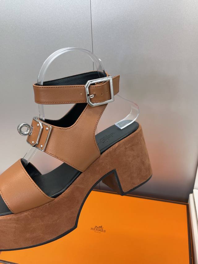 工厂P价P 莞产 代购级 爱马仕 Hermes 2025春夏新款 Kelly扣 Lola拼色粗跟女鞋 H家高跟厚底防水台圆头罗马风交叉带凉拖鞋 材质:鞋面进口小牛皮 进口羊猄皮+水染牛皮内里+原版开模大底 跟高:7.5Cm 防水台:3.5Cm Size: 34-43 34.40.41.42.43定制不退换