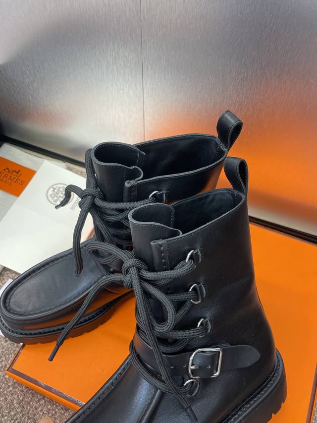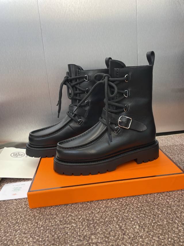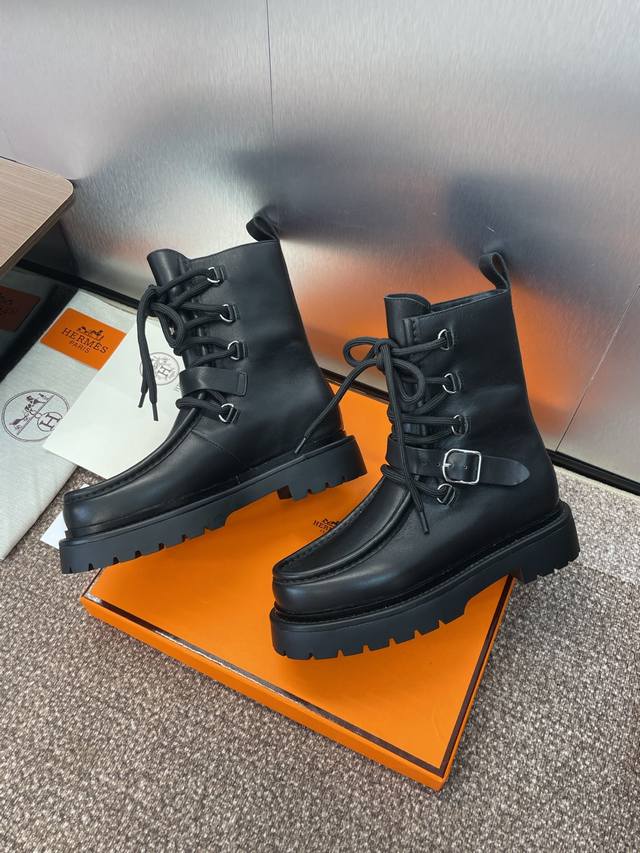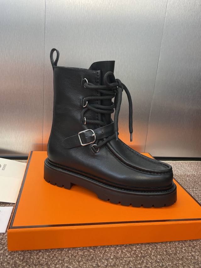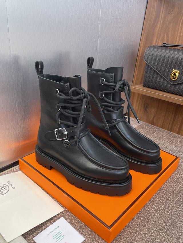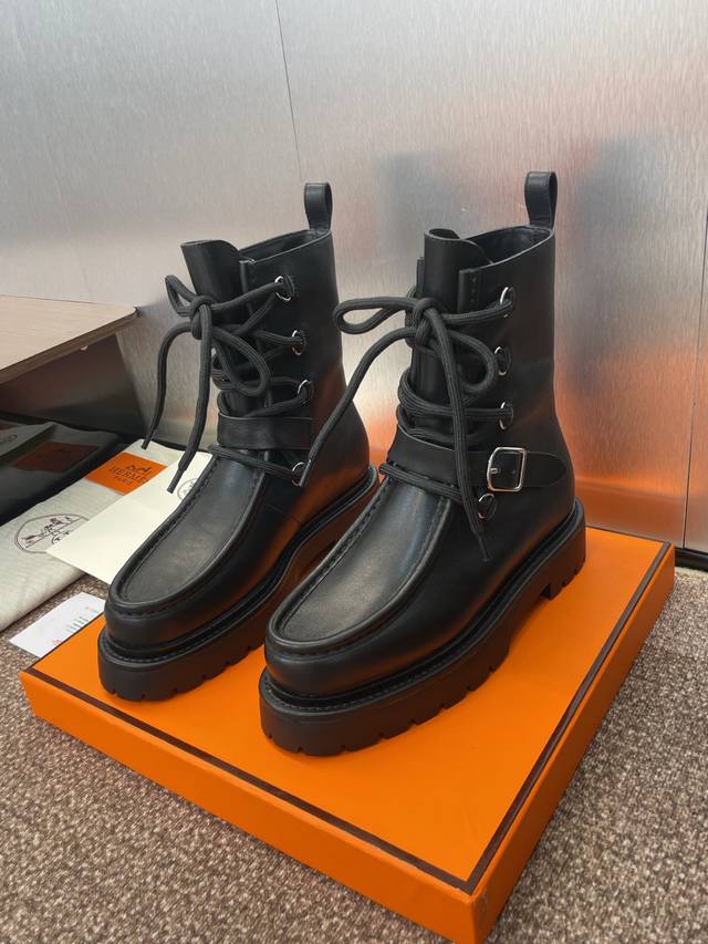 工厂P价P 莞货 代购级 Hermes 爱马仕 2025秋冬新款 Land 朋克风格系带及裸女短靴 H家明星同款字母Logo五金扣厚底低跟圆头机车骑士军靴 材质:鞋面进口小牛皮+水染牛皮内里+原版开模真皮沿条橡胶大底 跟高:3.5Cm Size:35-39 40定制不退换