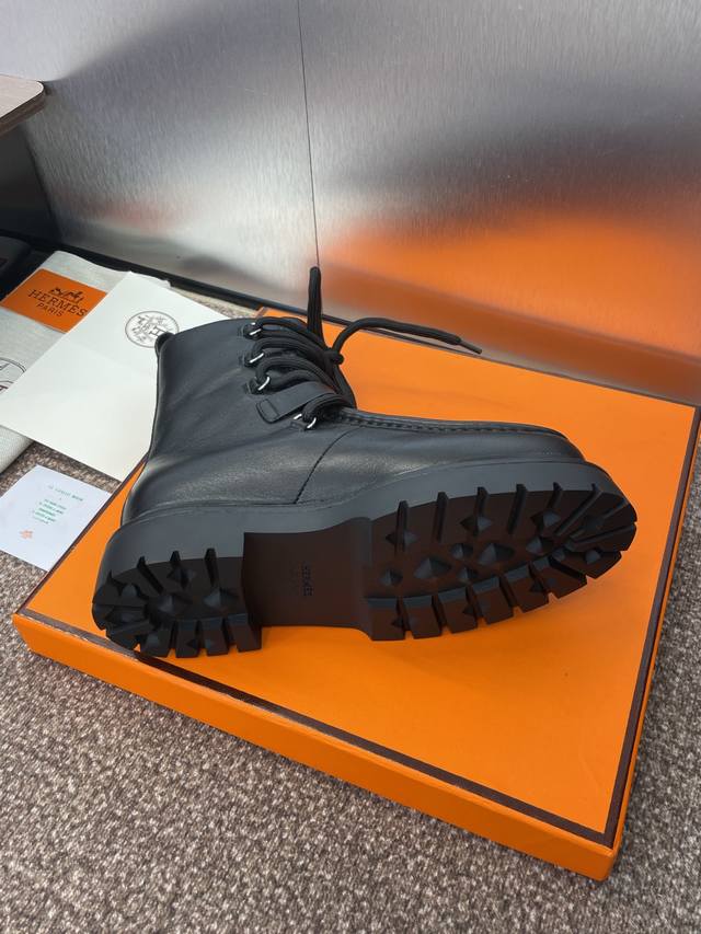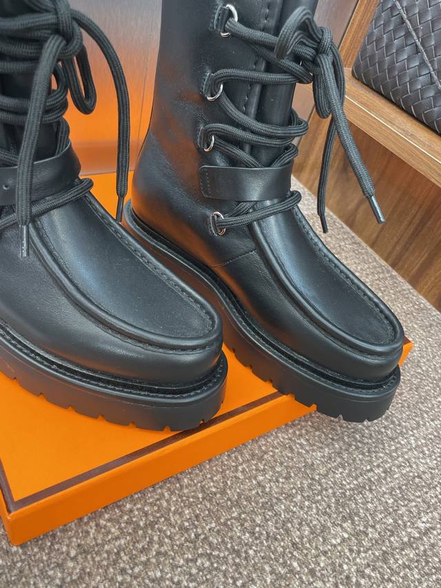 / 工厂P价P 莞货 代购级 Hermes 爱马仕 2025秋冬新款 Land 朋克风格系带及裸女短靴 H家明星同款字母Logo五金扣厚底低跟圆头机车骑士军靴 材质