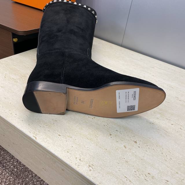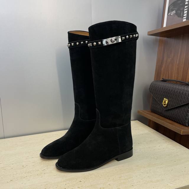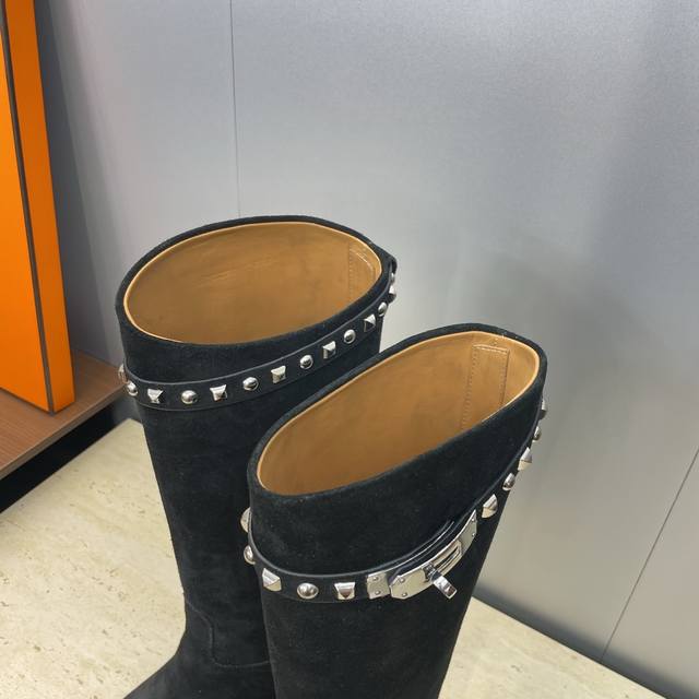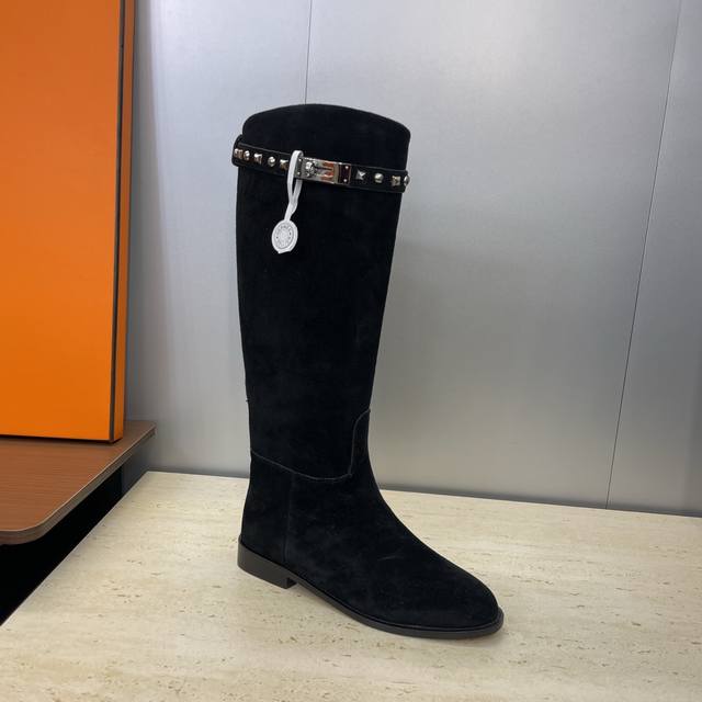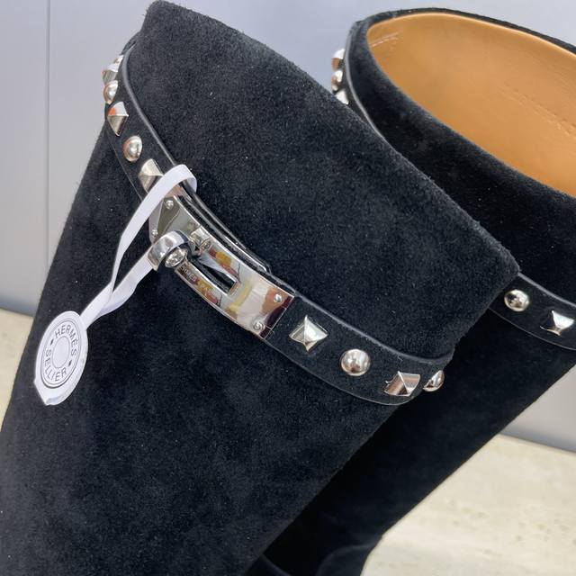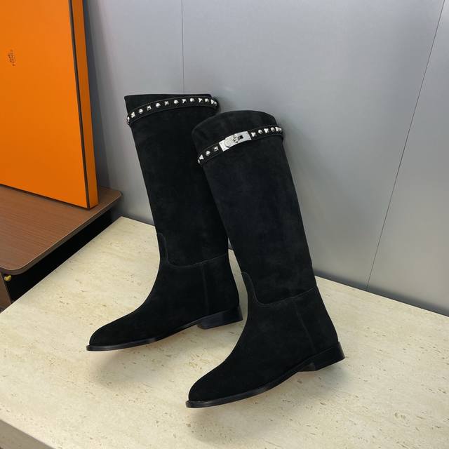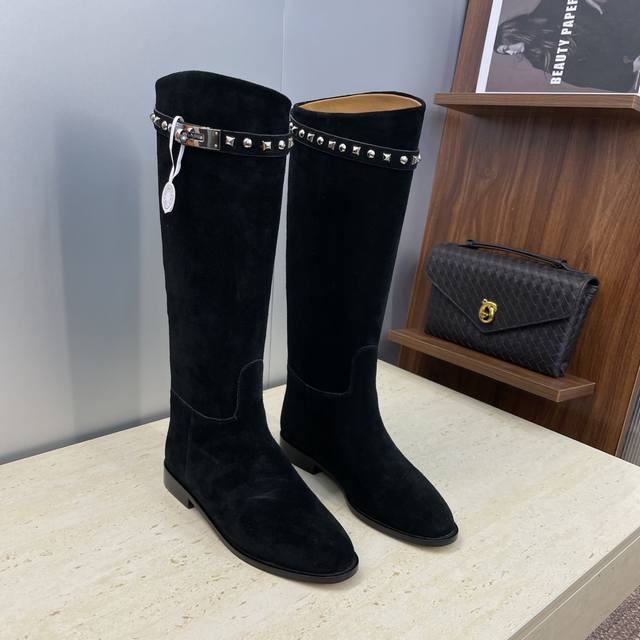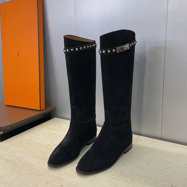 工厂p价p 莞货 Hermes爱马仕经典铆钉顶级版系列Box Jumpling朋克风格Kelly扣低跟高筒及膝拼色女长靴 H家明星同款字母Logo圆头一脚蹬机车