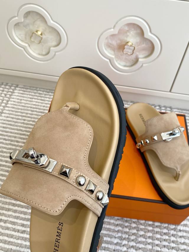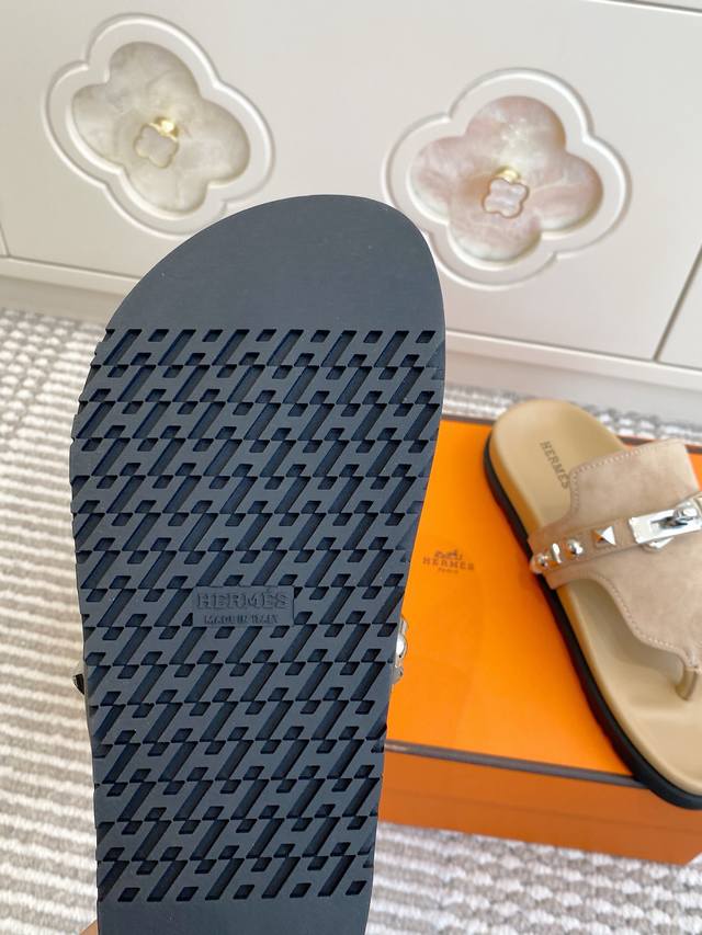 情侣 Ddd Hermes 爱马仕H家Empire Ddd 系列 Kelly扣铆钉夹趾拖鞋 Ddd 顶级品质 Ddd 小牛皮拖鞋,搭配人体工学鞋底和Kelly鞋扣 Ddd 鞋面:进口小牛皮 牛京 Ddd 原版开模大底 Ddd 男女同款:35-45 46定做 DDD