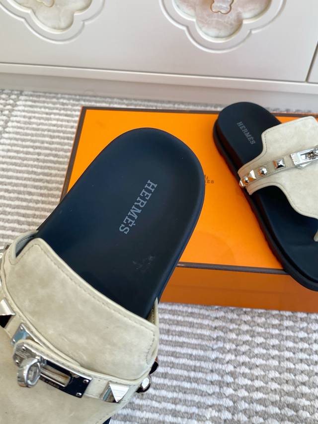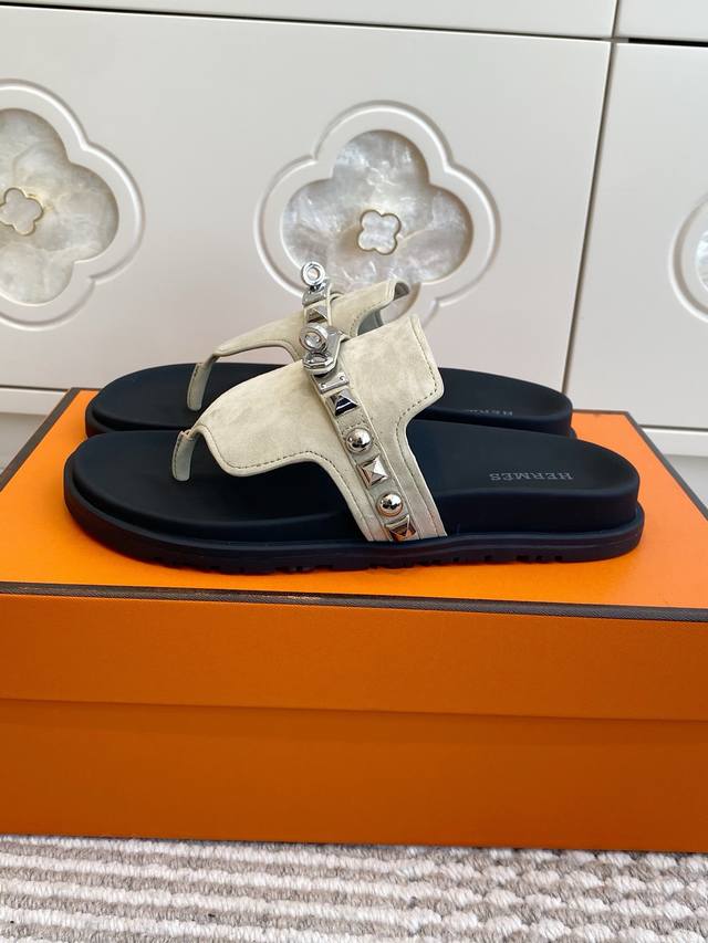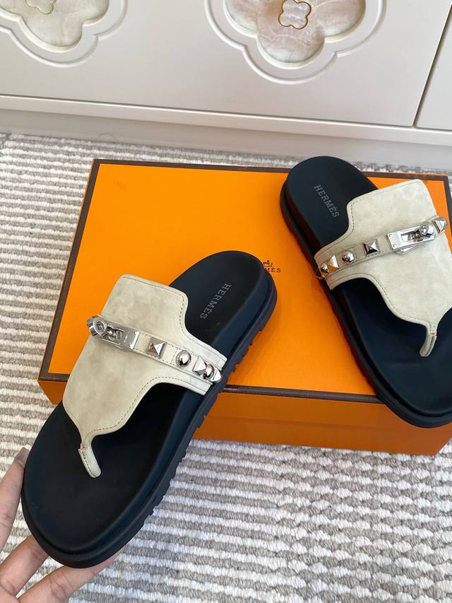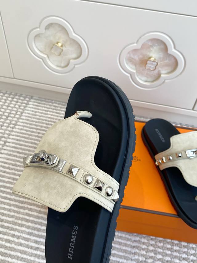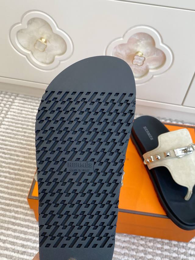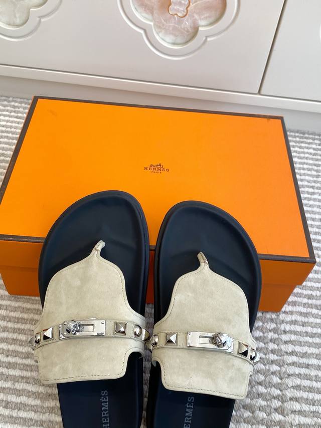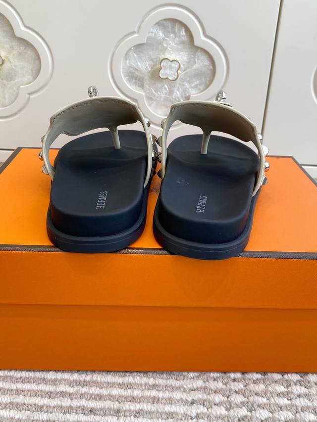 情侣 Ddd Hermes 爱马仕H家Empire Ddd 系列 Kelly扣铆钉夹趾拖鞋 Ddd 顶级品质 Ddd 小牛皮拖鞋,搭配人体工学鞋底和Kelly鞋扣 Ddd 鞋面:进口小牛皮 牛京 Ddd 原版开模大底 Ddd 男女同款:35-45 46定做 DDD