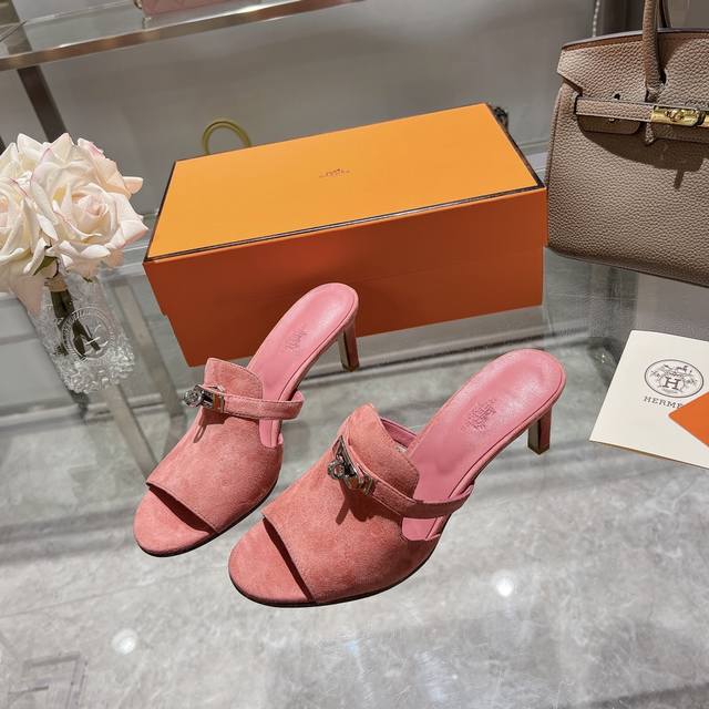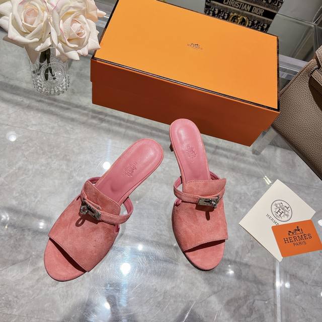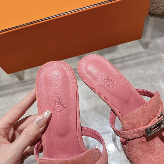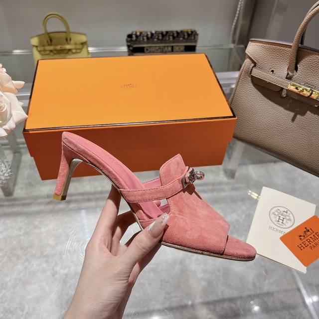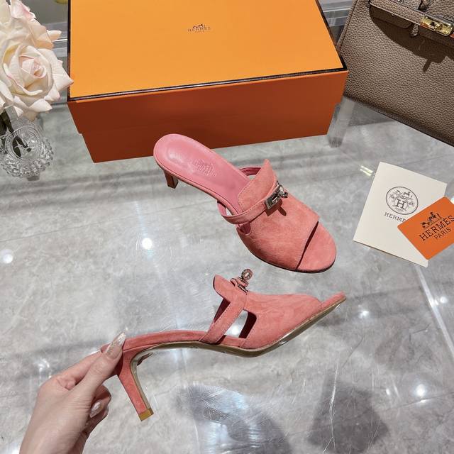 / 新加配色出厂价 Herme*春夏专柜新款质感凉拖系列 鞋面:原版麂皮 内里:混种羊皮 大底:原版意大利真皮大底 跟高: 6.5cm 包装:原版一致专柜配套包装