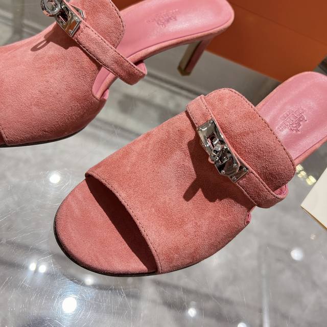 新加配色出厂价 Herme*春夏专柜新款质感凉拖系列 鞋面:原版麂皮 内里:混种羊皮 大底:原版意大利真皮大底 跟高: 6.5cm 包装:原版一致专柜配套包装