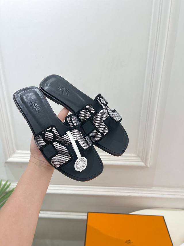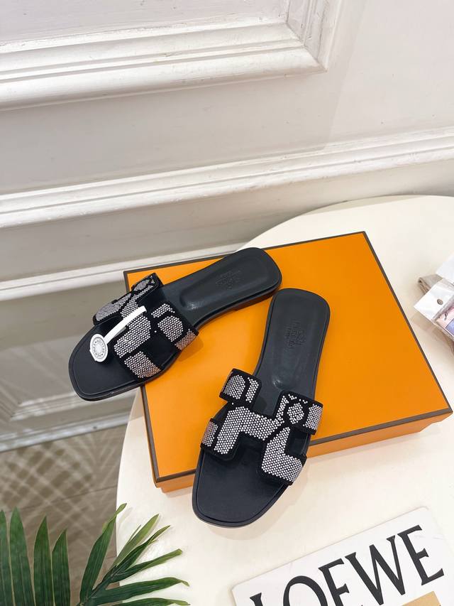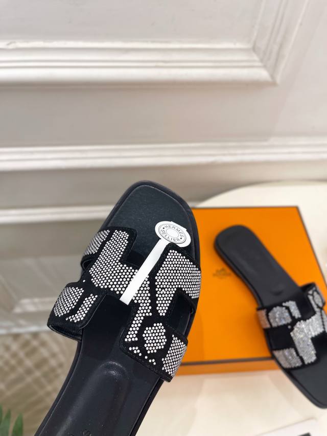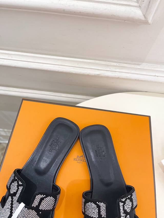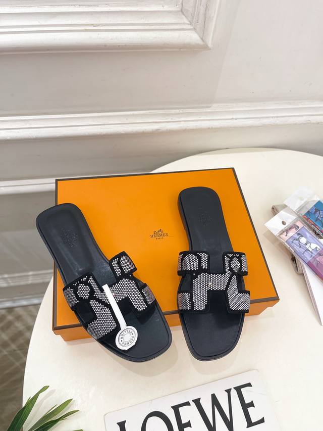 / 爱玛仕 25 2025春夏新品 顶级版本经典H型钻面粗跟平底拖鞋系列 鞋面:原版特定布料 内里:进口混种羊皮 大底:原版意大利真皮大底 跟高:平底 5Cm 鞋码