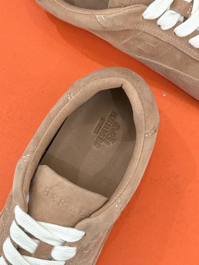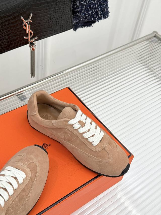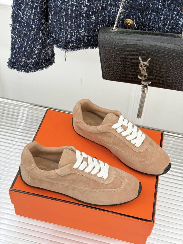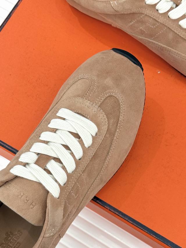 爱马仕新款系带跑步休闲德训鞋 Ddd 经典运动风格+英伦风拼色设计,经典耐看!原版倒模楦型,极致1:1形体,进口小牛皮呈现出精致质感!开模定制A级高密私模大底,奢华包装! Ddd 面料:原版定制牛反绒 牛皮料 Ddd 内里:原版定制羊皮内里垫脚 Ddd 大底:原版开模Tpu大底 Ddd 码数:35-40 [40.41订做] DDD