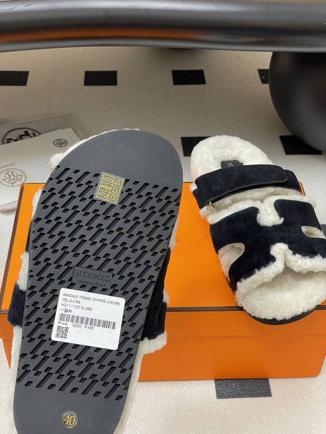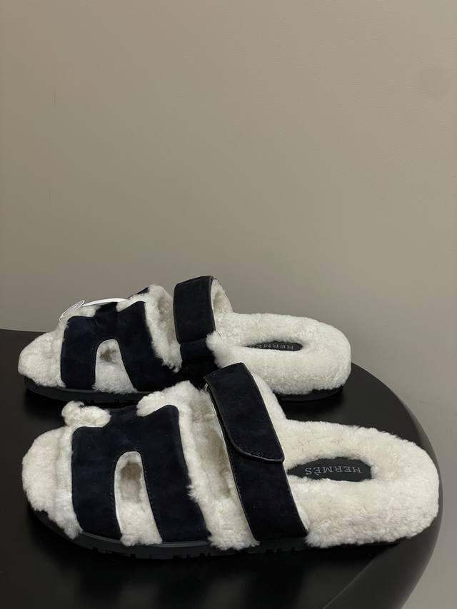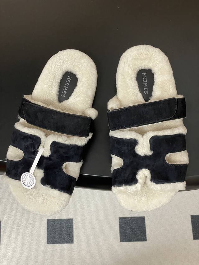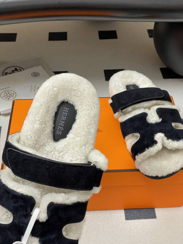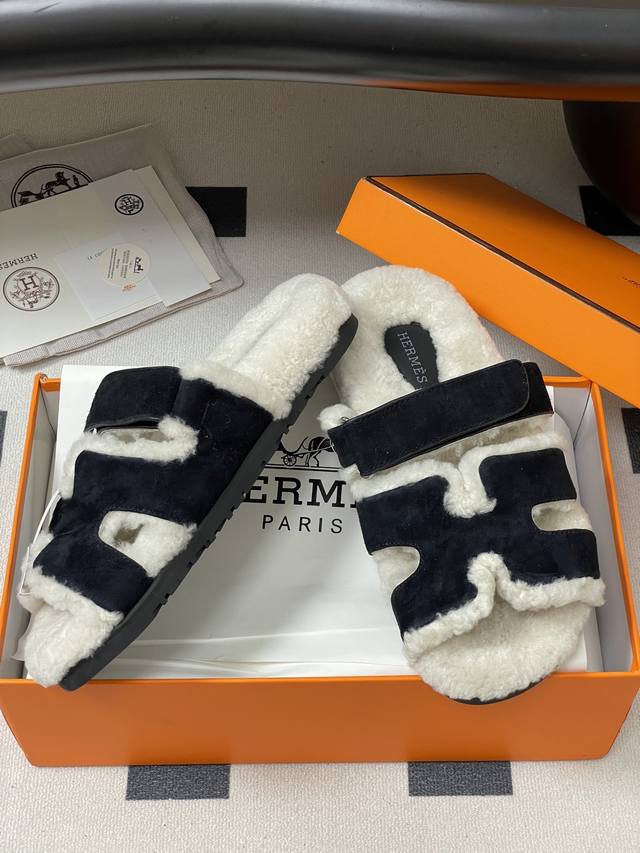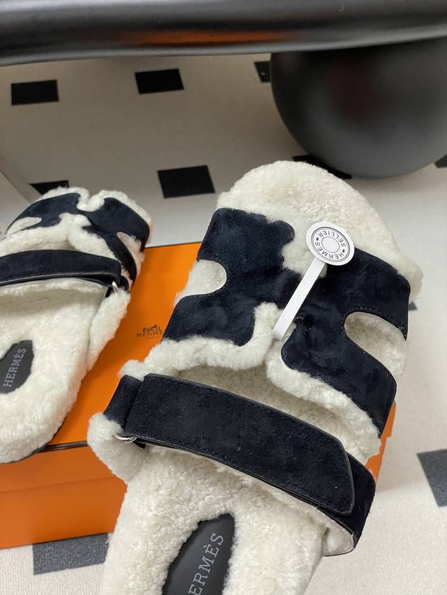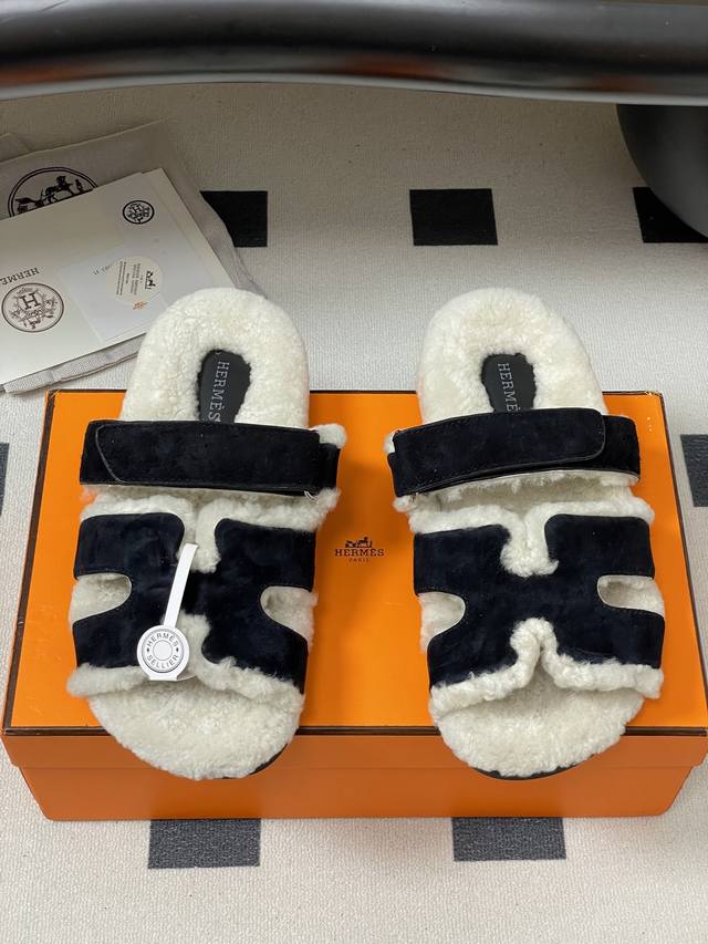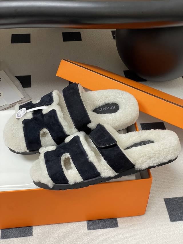 Hermes 爱马仕 H家 Cheryp毛拖鞋系列 经典款二舅拖鞋H型魔术贴平底二舅羊羔毛凉拖鞋情侣款休闲懒人鞋