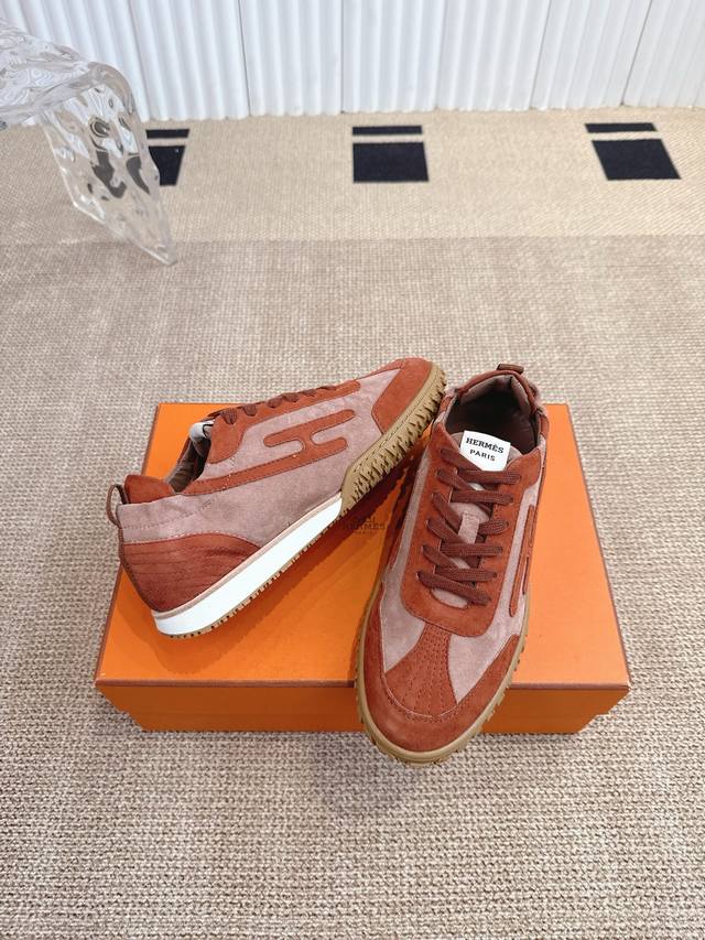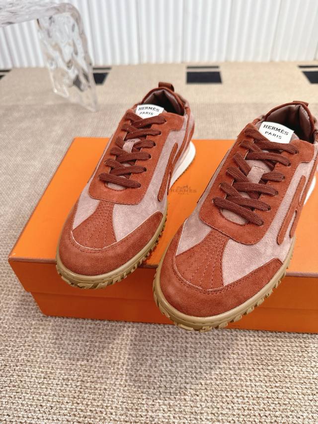 / 男420Hermes 爱马仕新情侣款阿甘德训鞋 麂皮山羊皮运动鞋装饰撞色图案和标志性“H”细节面料:麂皮+牛皮内里:混种羊里 大底:原版Tpu底厚:2Cm 码数