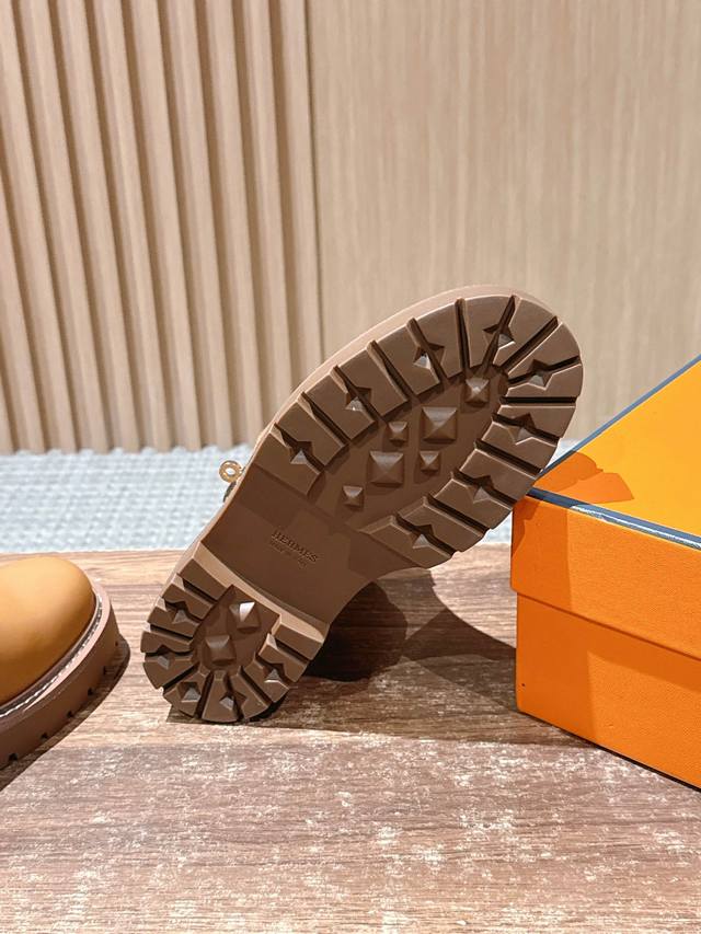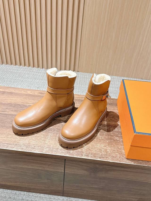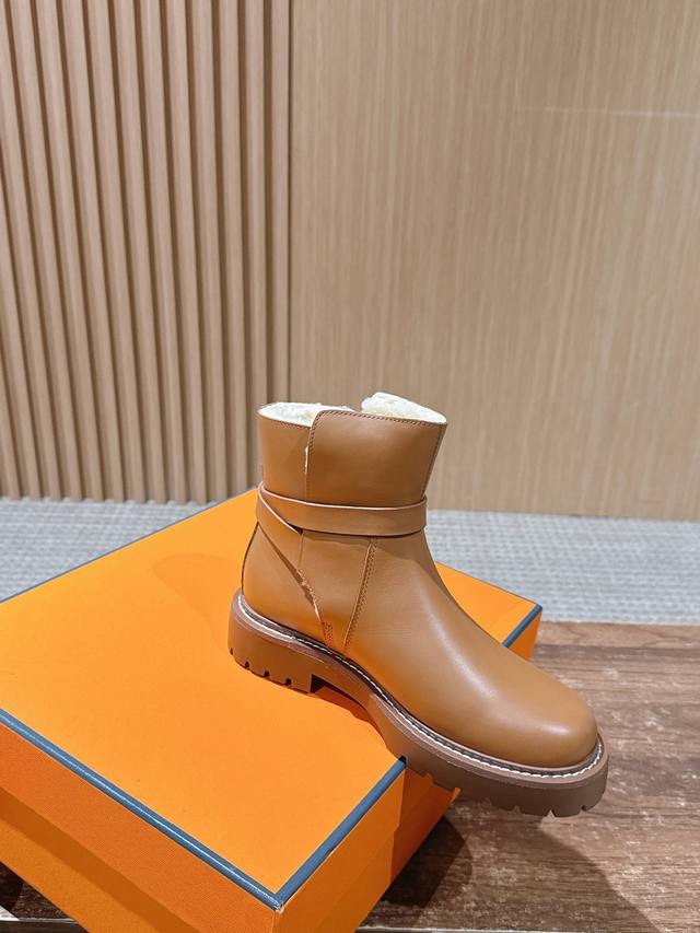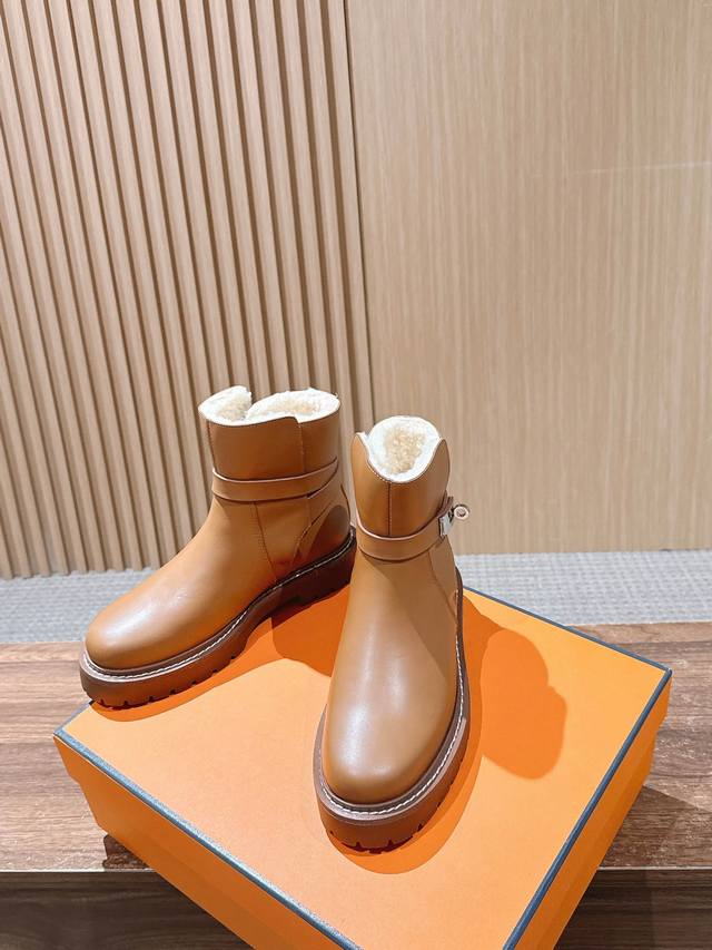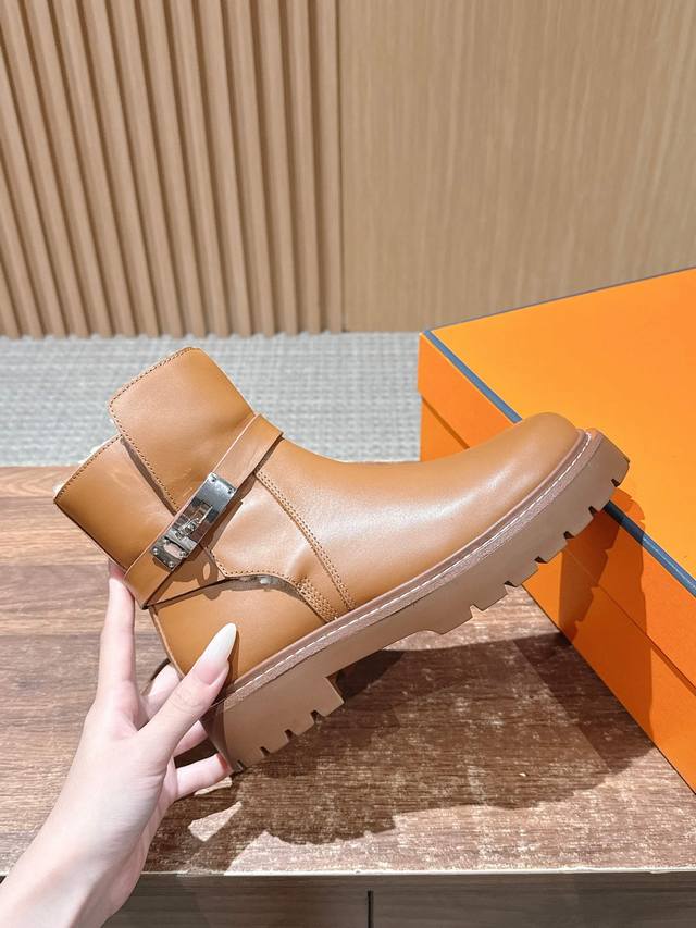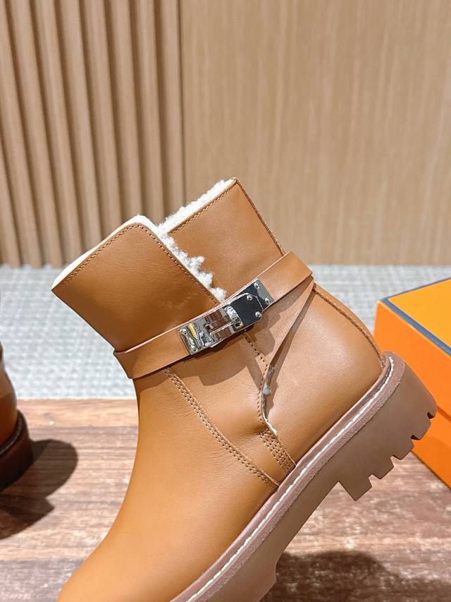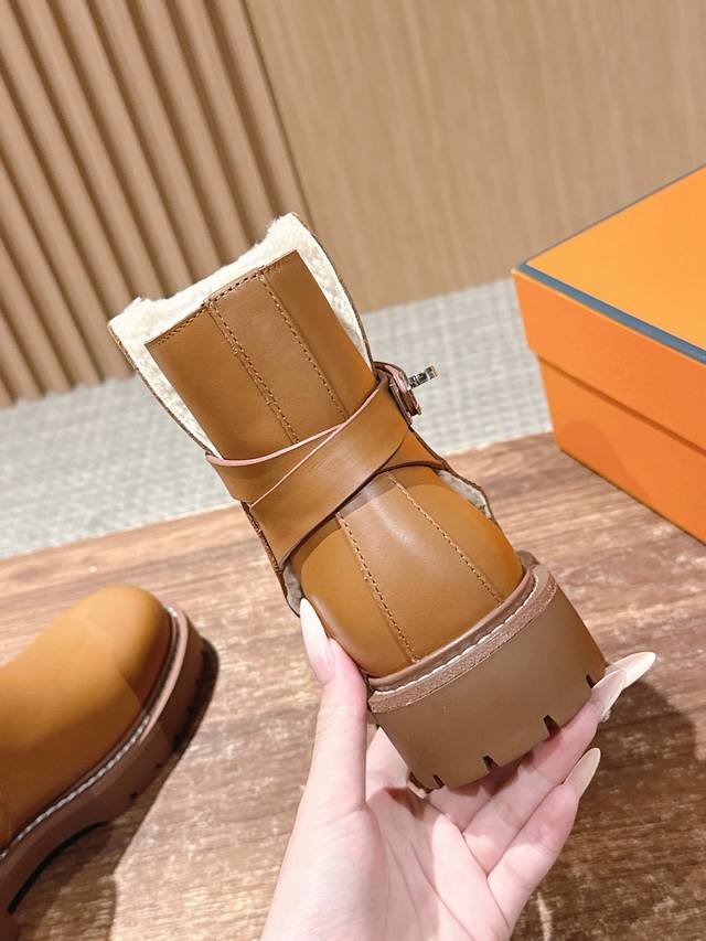 皮面 Hermes 爱马仕秋冬加绒款金属扣马丁靴 DDD 鞋身搭配金属扣饰绑带,既强化了设计感,又可通过调节绑带适配不同脚型与腿围,提升贴合度;品牌标志性的精致细节,彰显爱马仕的奢华辨识度。属于短筒靴型,靴筒高度适中,方便活动且能适度修饰脚踝线条; DDD 鞋底为厚底设计,在保障行走舒适度的同时,增添了几分利落感,适配秋冬各类穿搭。整体风格兼具奢华感与实用性,既能满足日常出行的保暖需求,又能提升造型的精致度与高级感。 DDD 鞋面:胎牛皮 胎牛绒 DDD 内里:羊毛 DDD 大底:Tpu大底真皮沿条 DD