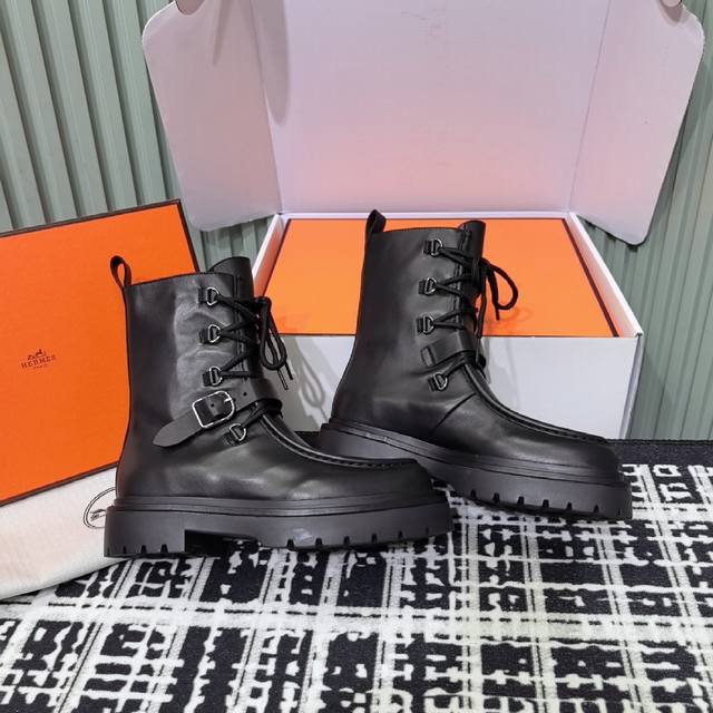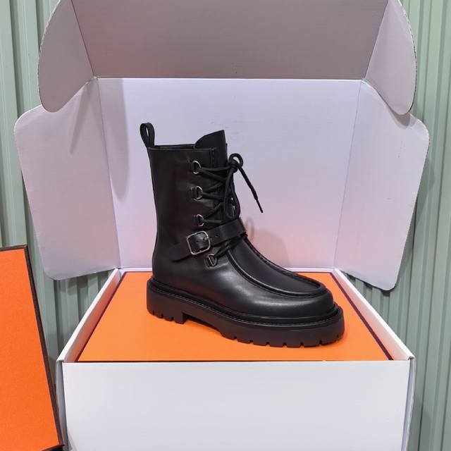 莞产顶级, Hermes超级有档次的一款机车风皮带扣骑士靴,必须来一双! Hermes爱马仕25Fw秋冬新款Land及踝靴系列,机车风皮带扣系带厚底靴! 经典经典!靴子的设计风格通常以经典、简约为主,注重线条的流畅性和造型的优雅感。没有过多繁杂的装饰,却能展现出高贵大气的特质,这种简约之美符合品牌一贯的高端定位,也使其产品具有跨越时代的时尚感,能够长久流行。 呈现出经典的款式,线条流畅自然,能够优雅地包裹腿部线条,展现出修长的腿部轮廓,无论是搭配裙装还是裤装都别有一番风味 在入秋之前,靴子绝对是造型和搭配